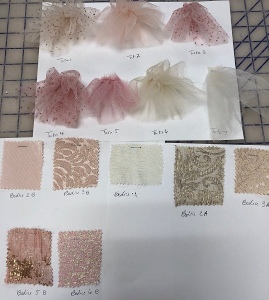 If you would like us to choose colors/fabric types for you (DESIGN WORK), YOU WILL NEED TO ALSO CHOOSE THE 'ADD DESIGN FEE' OPTION. When choosing this option, our in-house designers will put together nets/tulles and bodice fabrics for your approval. You will not need to send us Sku numbers, or specific fabric choices. You will only need to send us information on what the design will be used for: Examples - "Paquita Tutu," "Sugar Plum Fairy," "Odile/Black Swan." If we need to custom-dye any samples, we will send you an invoice with a secure link for payment for that through email. Custom dyeing small samples can run from $10 to $25, depending on number of samples and how many requested. We will talk to you before doing any custom dyeing.
