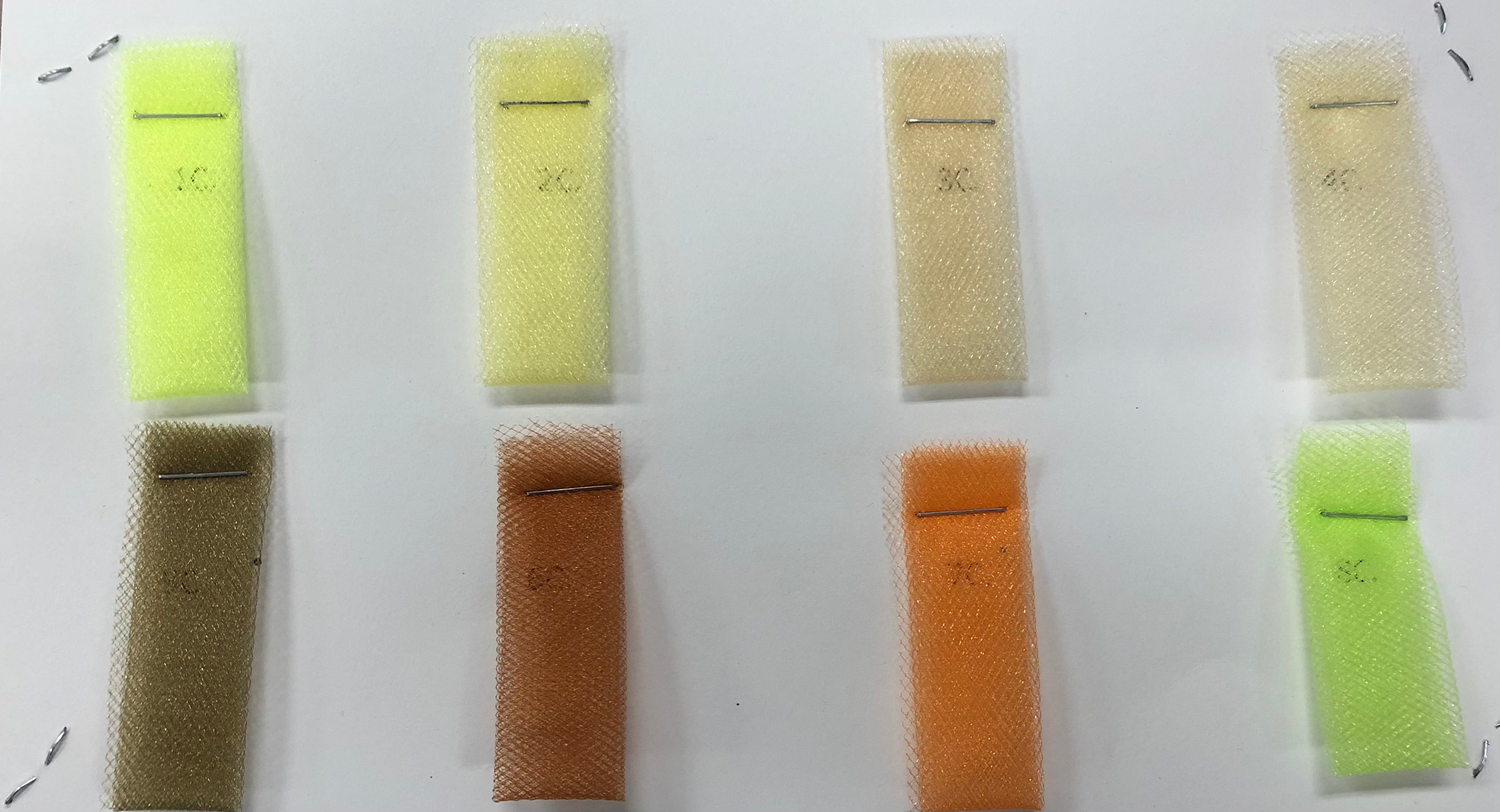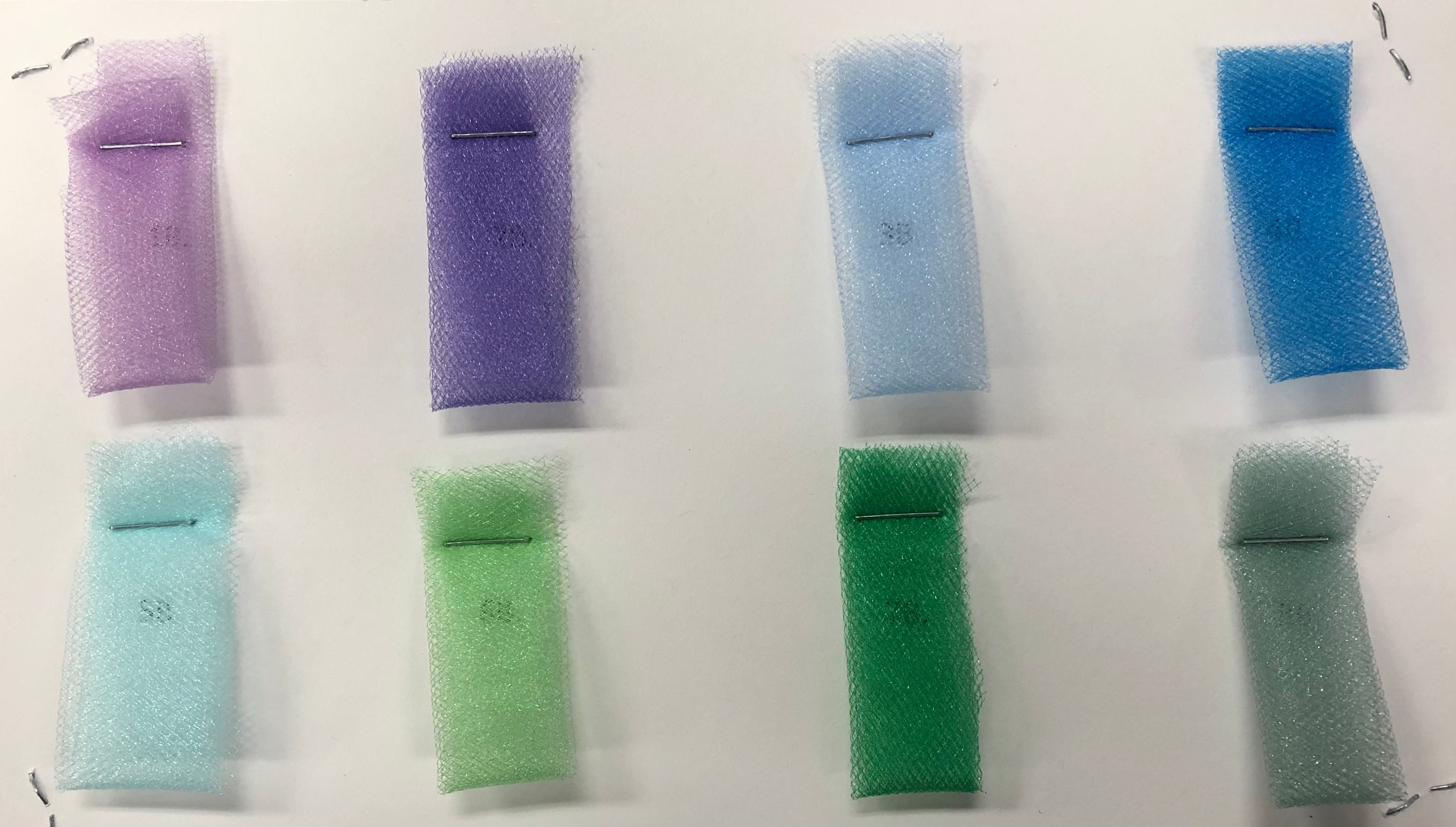 Priced per card. Four different glimmer tulle sample cards. Prices on back of each card.