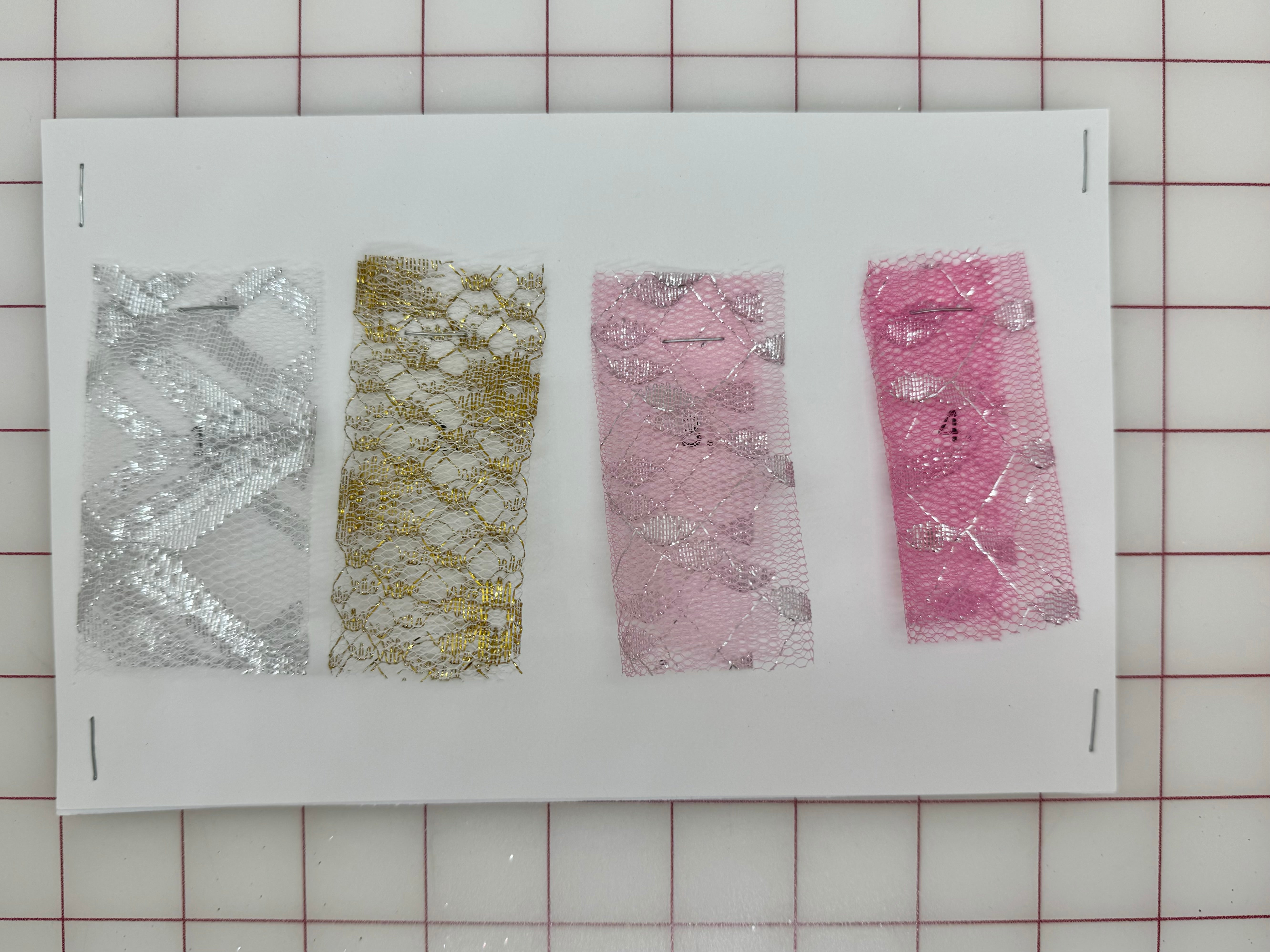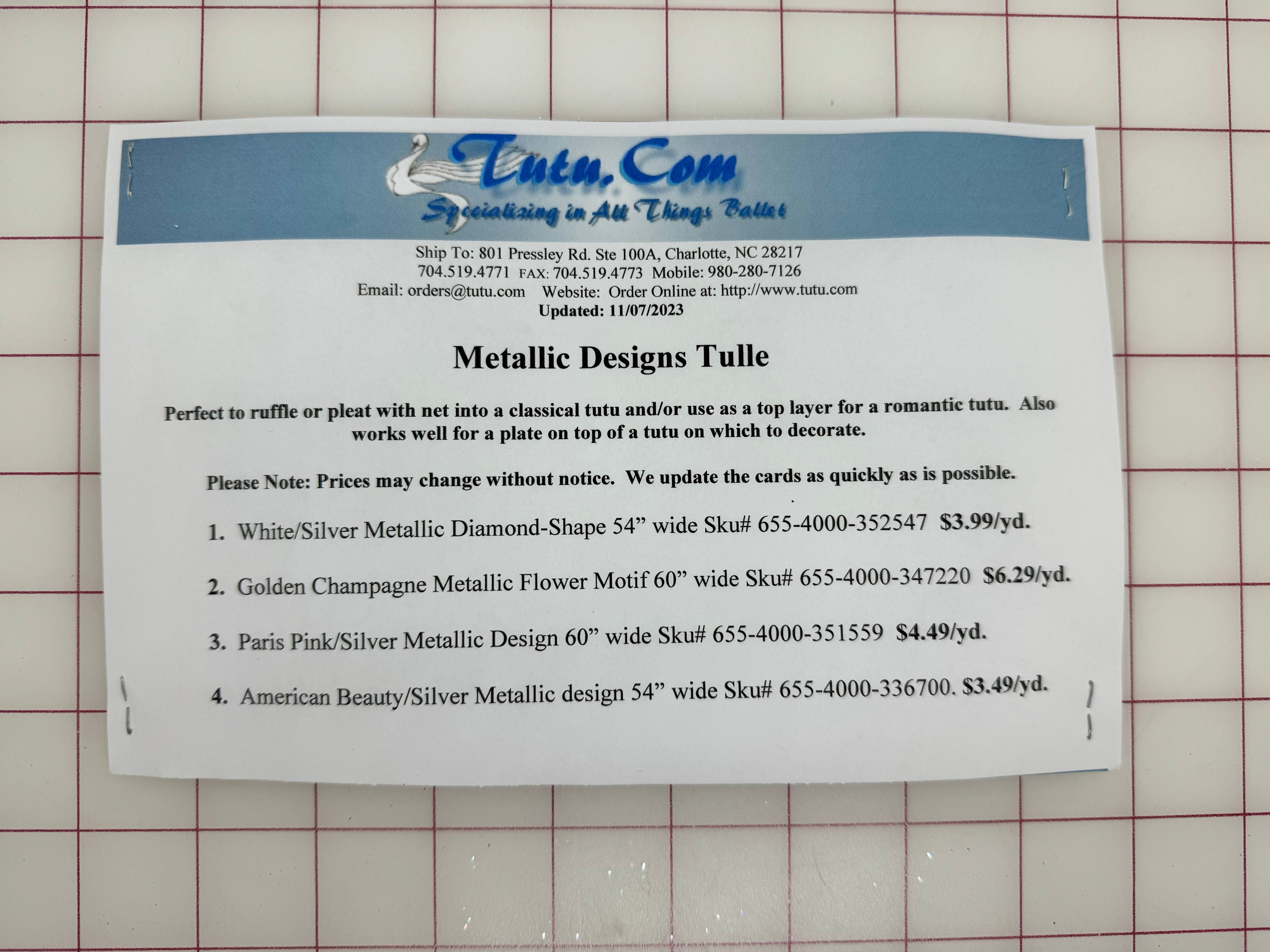 Priced per card. Metallic Designs Tulle sample card. Gorgeous! Prices/color names on back of each card (2nd picture).