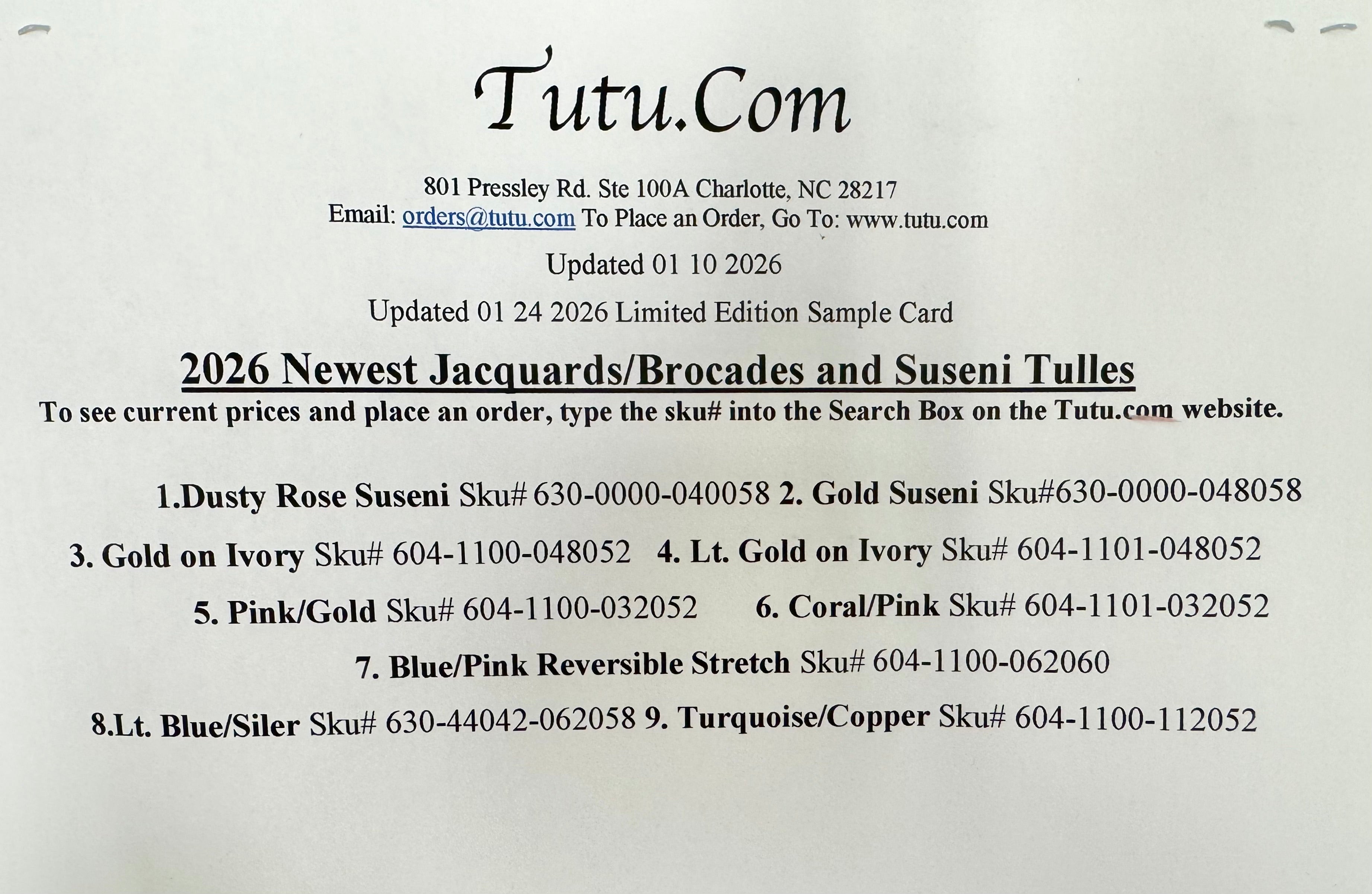 Priced per card. A limited edition sample card of our most recent 2026 jacquards/brocades and Suseni tulles.