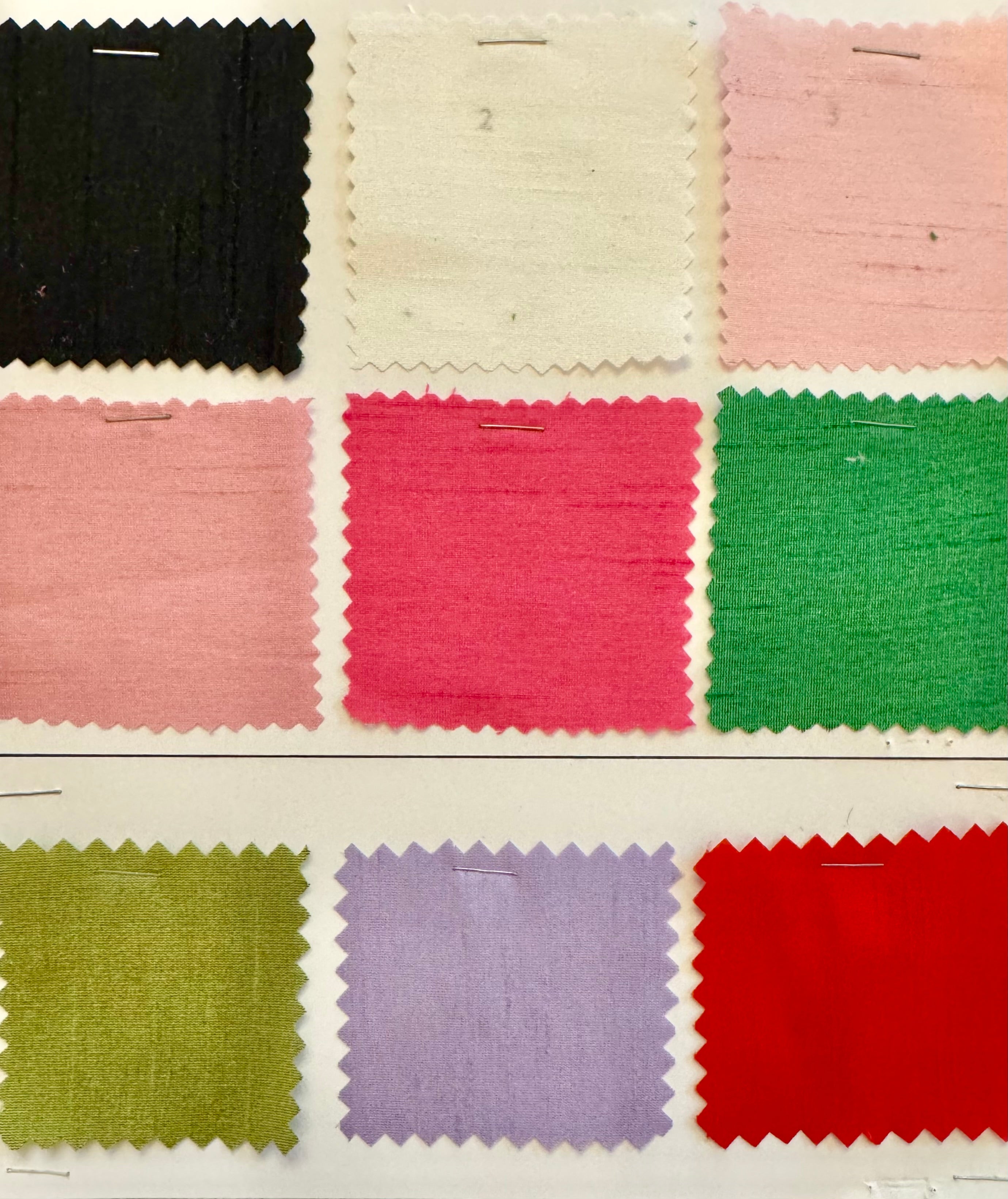 Priced per card. Silky Dupioni sample card. Prices on back of each card. This fabric is a tightly woven, washable, 100% polyester fabric which looks like silk dupioni but is a stronger weave. It stands up well to sweat and ballet movement. Excellent for use for ballet bodices.