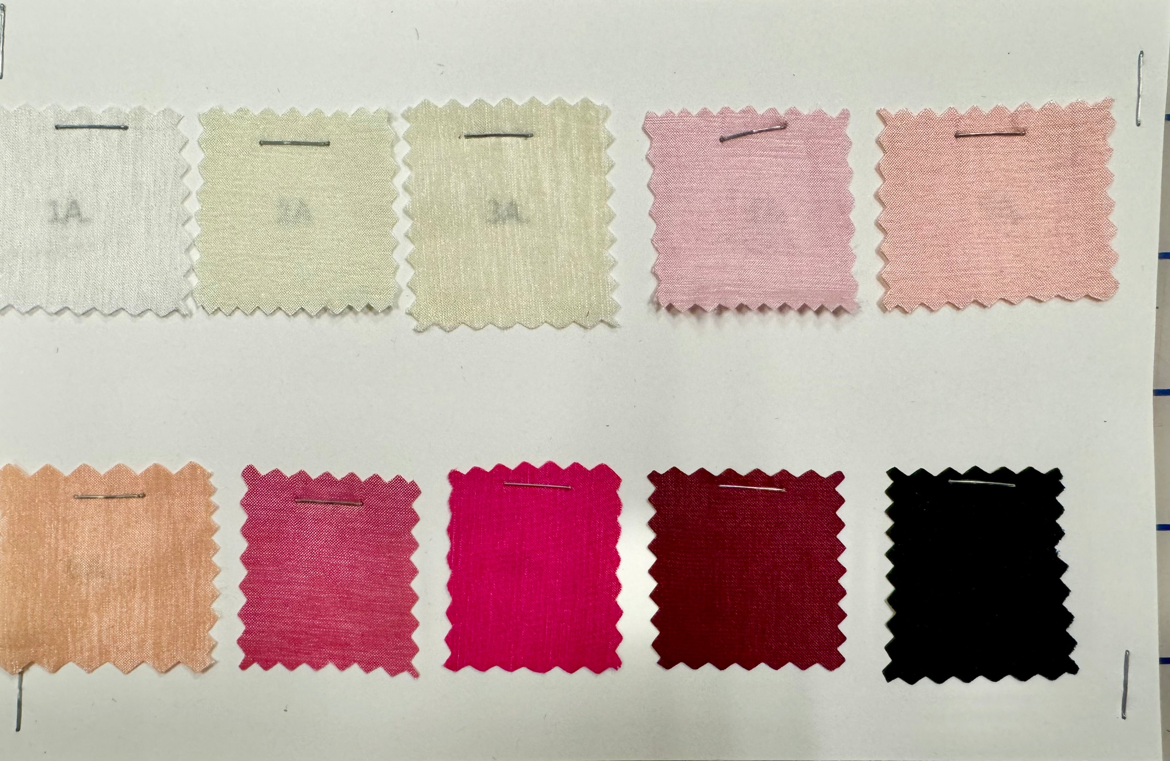 Priced per card. Three Stretch taffeta sample cards. Prices/widths/color names on back of each card.