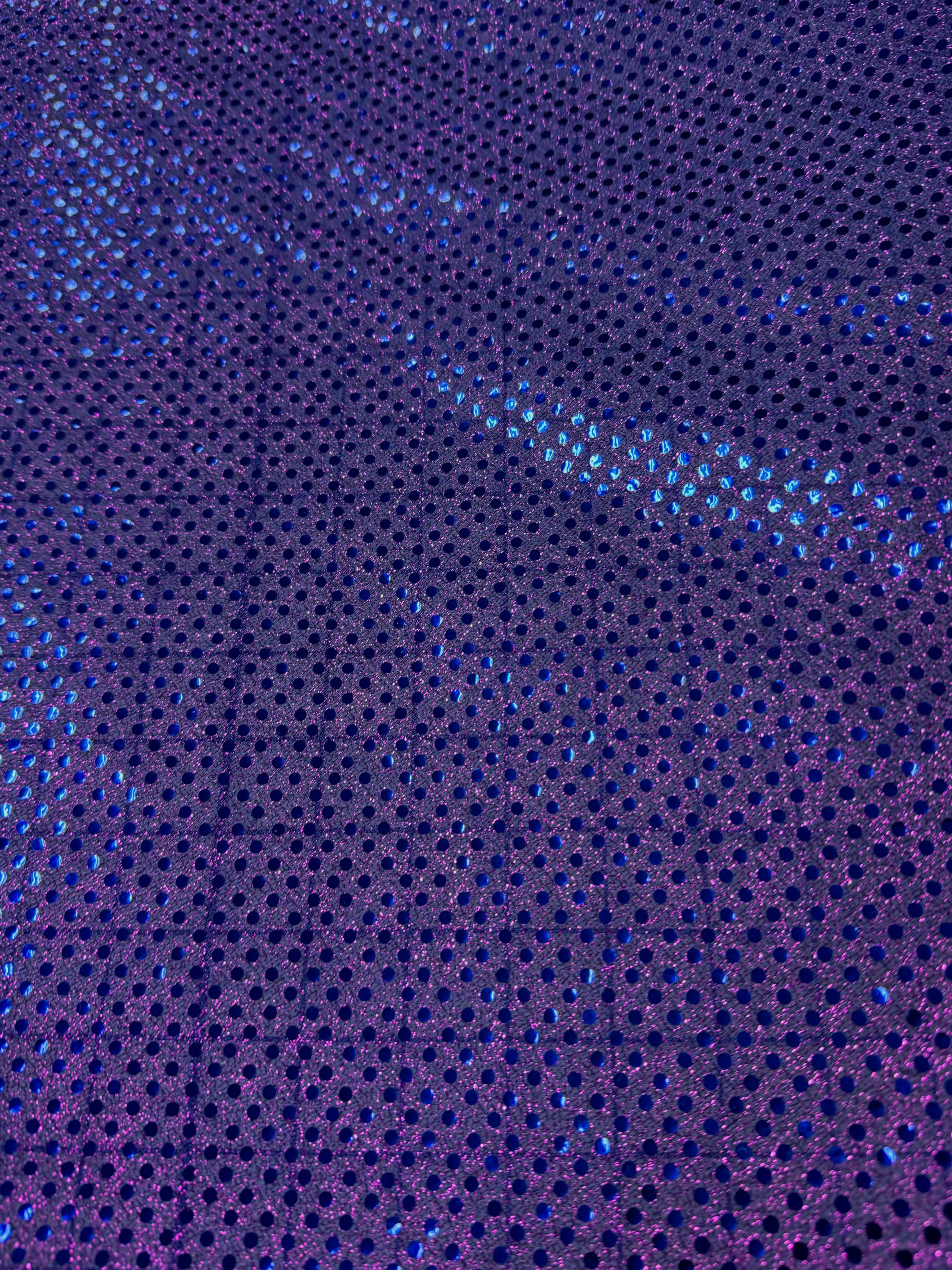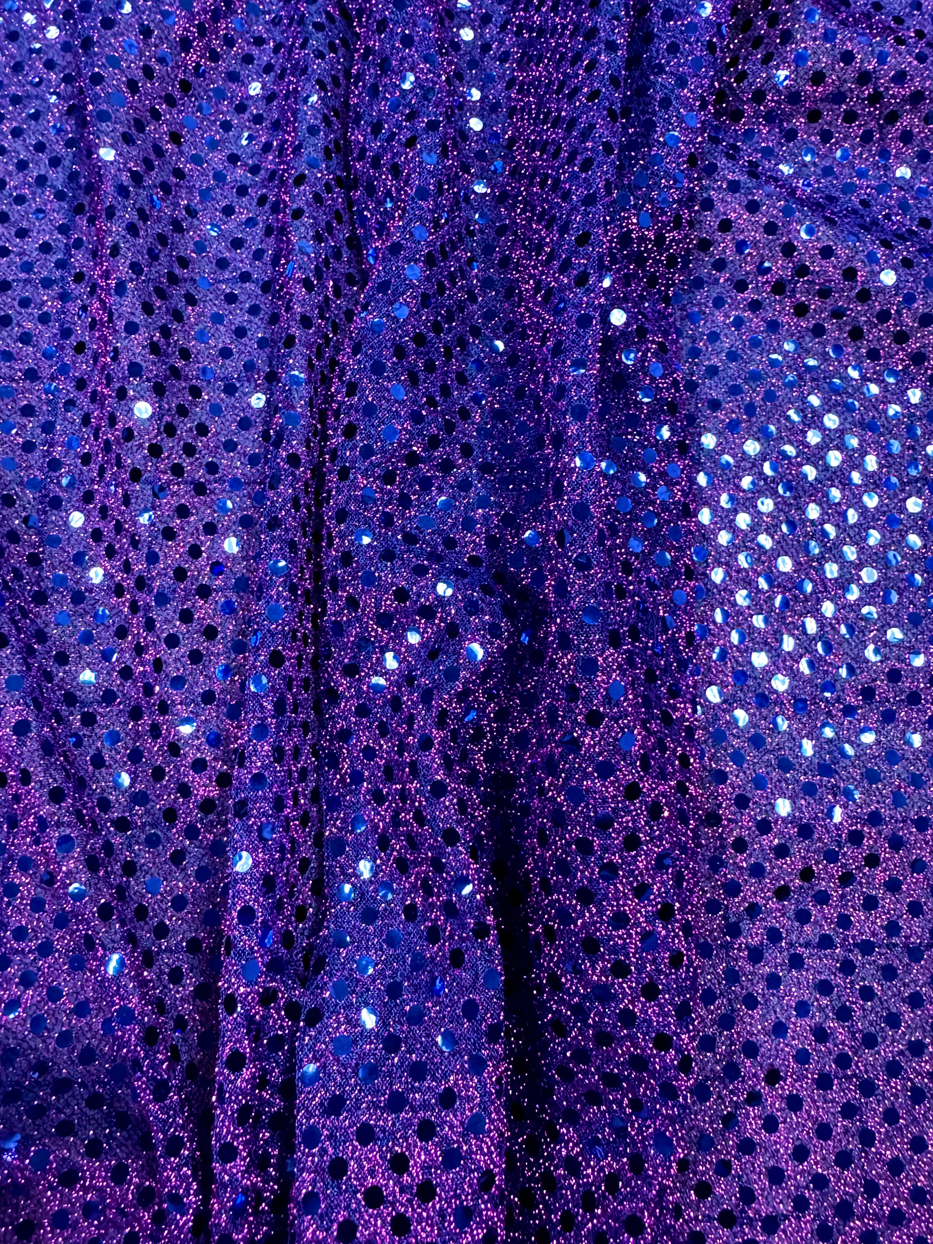 Priced per yard. Metallic purple with royal blue sequin dot fabric. Great for harem pants, jazz dance dresses, and many other costumes. 44-inches wide.