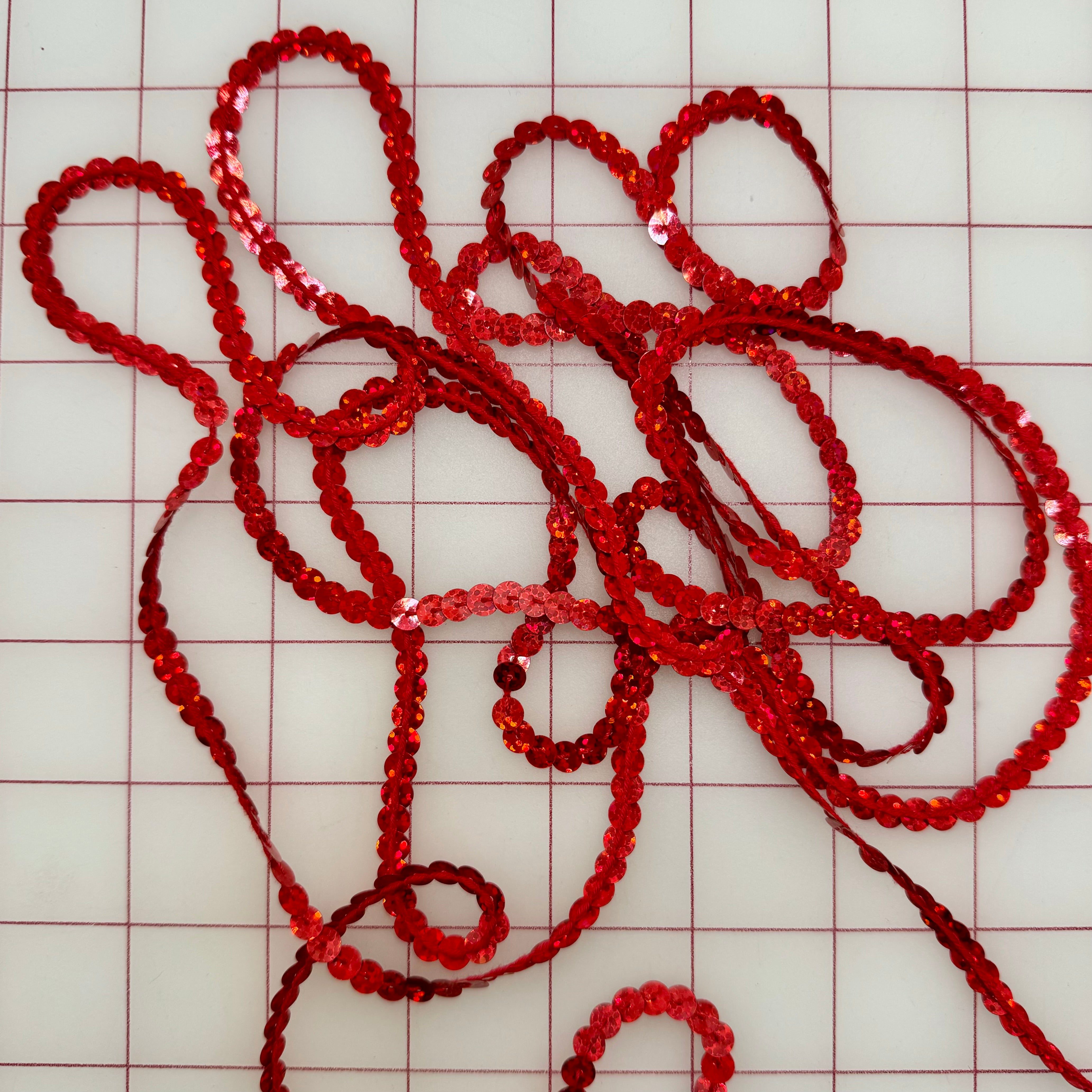 Priced per yard. Red sequin strands. 1/4-inch wide.