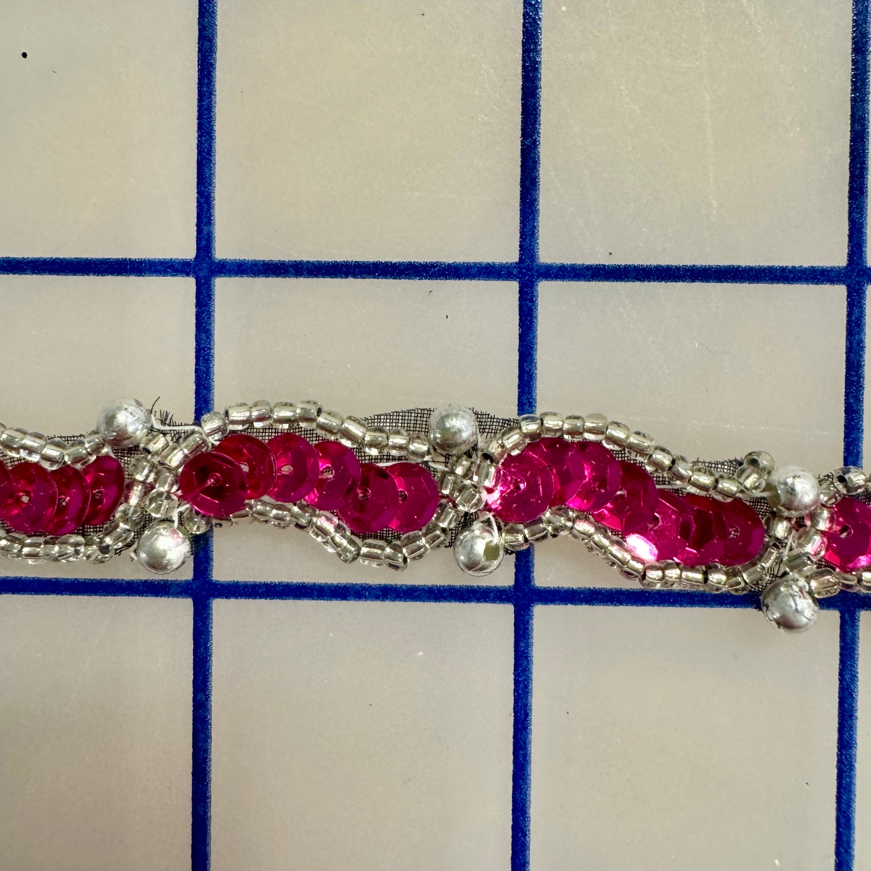 Priced per yard. Fuchsia metallic silver and sequined trim. 3/8-inch wide.
