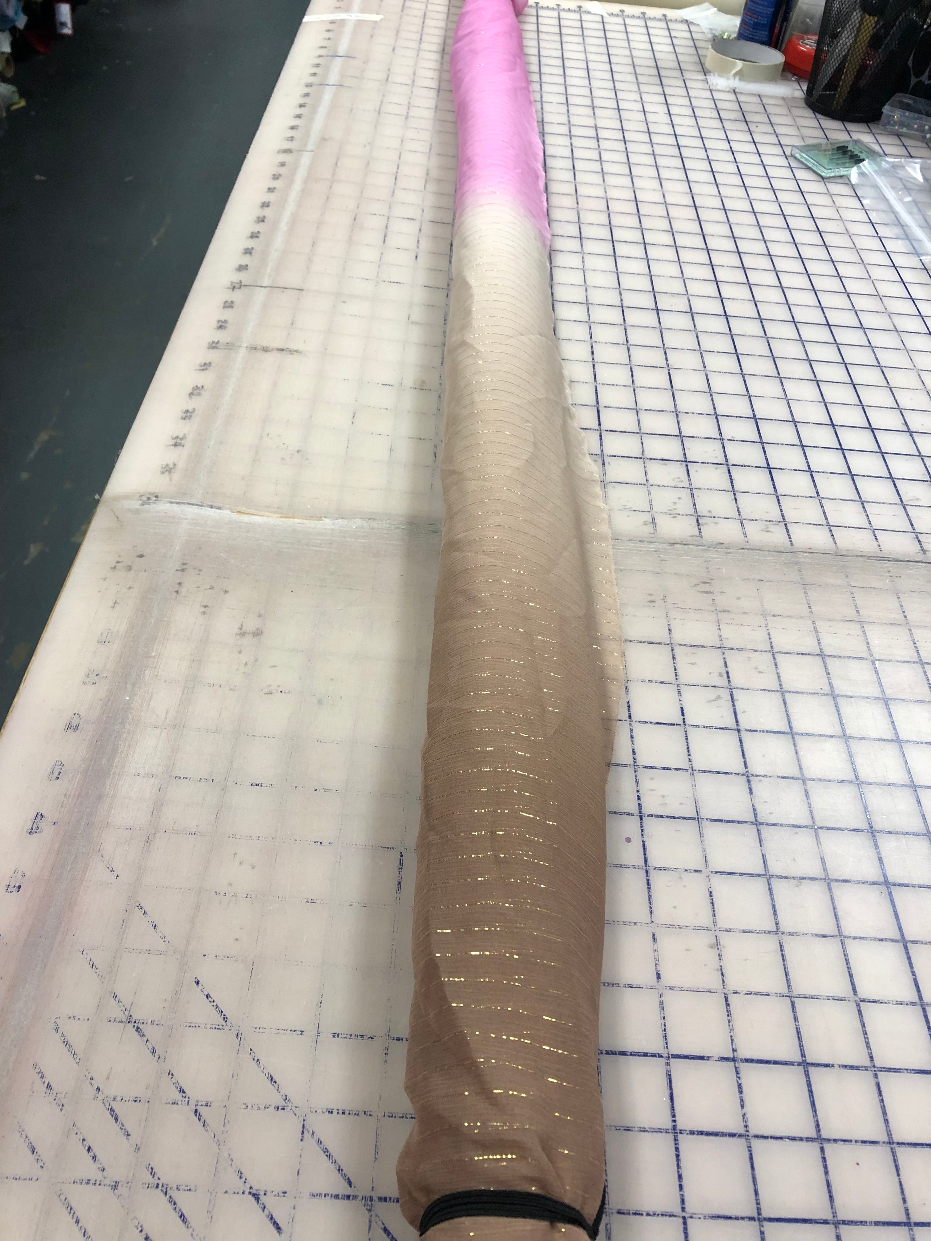 Priced per yard. Ombre bronze/beige/pink with metallic gold reflex stripe silk chiffon. Gorgeous silk chiffon - great for Empire-style dresses, ballet skirts, scarves, and anything that needs to have beautiful flow and movement. 58-inches wide. Special Purchase.