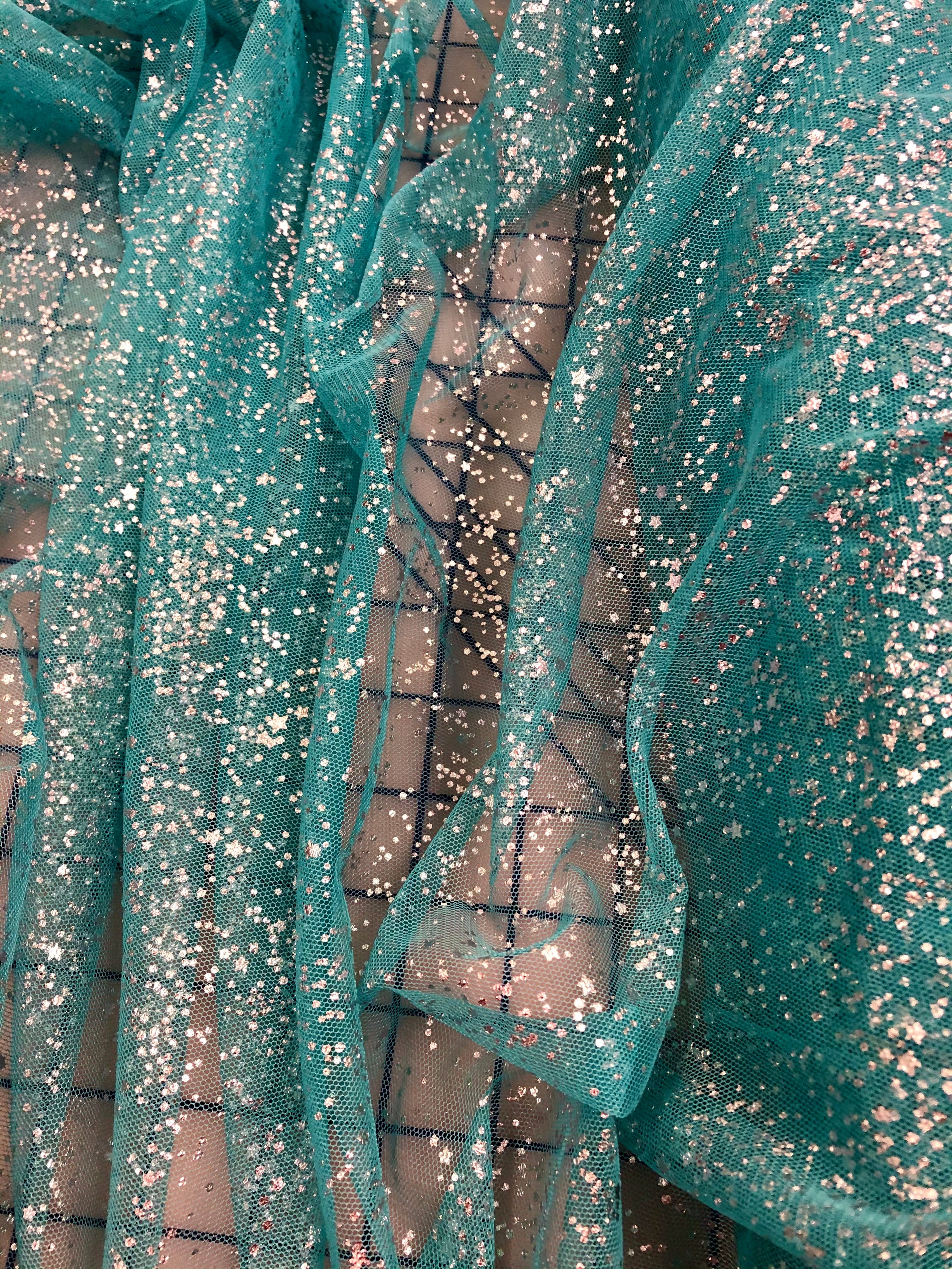 Priced per yard. Aqua with silver sparkle mesh 60 inches wide. Stretches across width of fabric only. Absolutely no shed of the sparkles. Great for many costumes - skirts, etc.