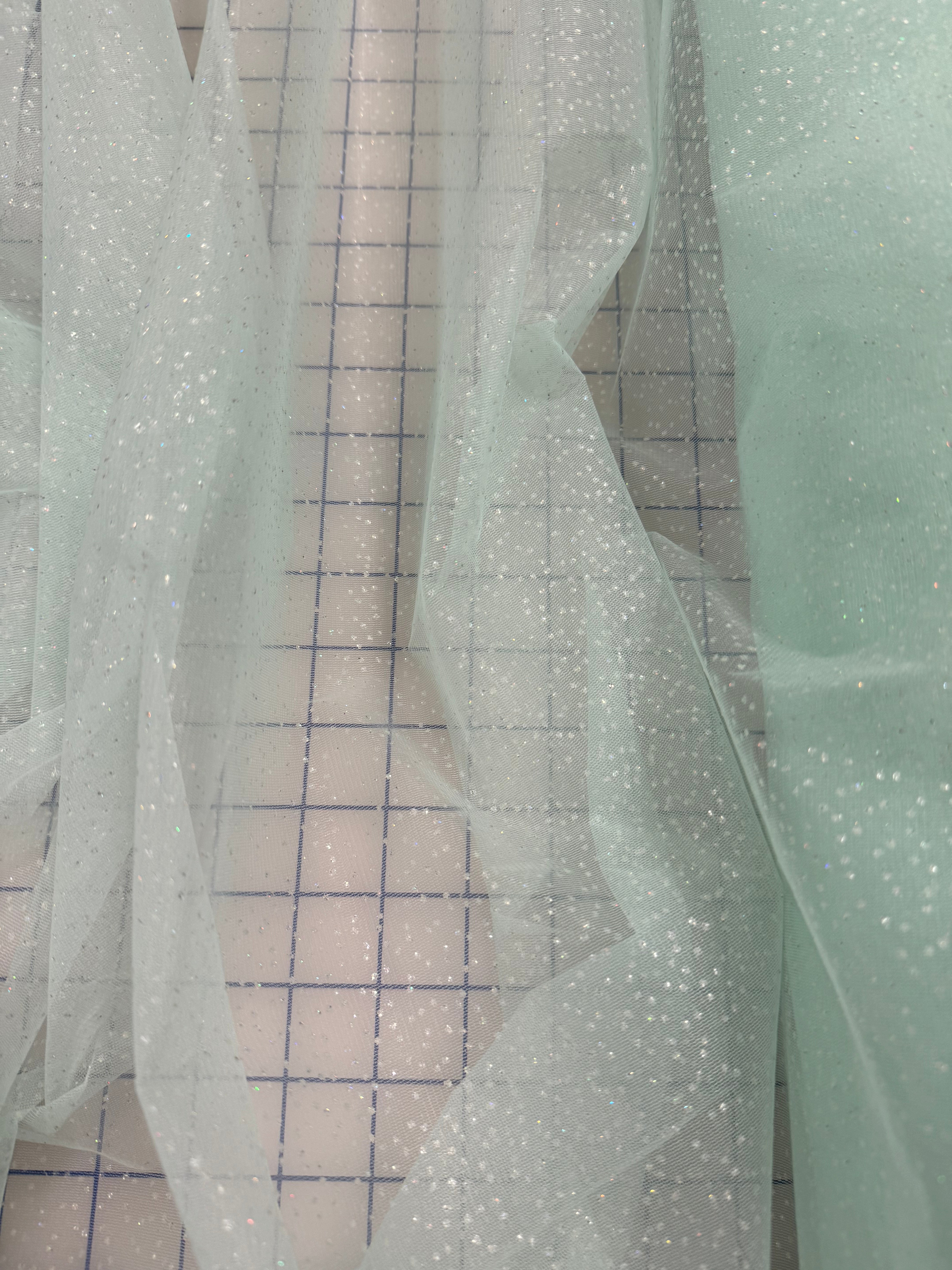 Priced per yard. Mint Julep Green Organza with silver sparkle microdots. 60 inches wide. Absolutely no shed of the sparkles.