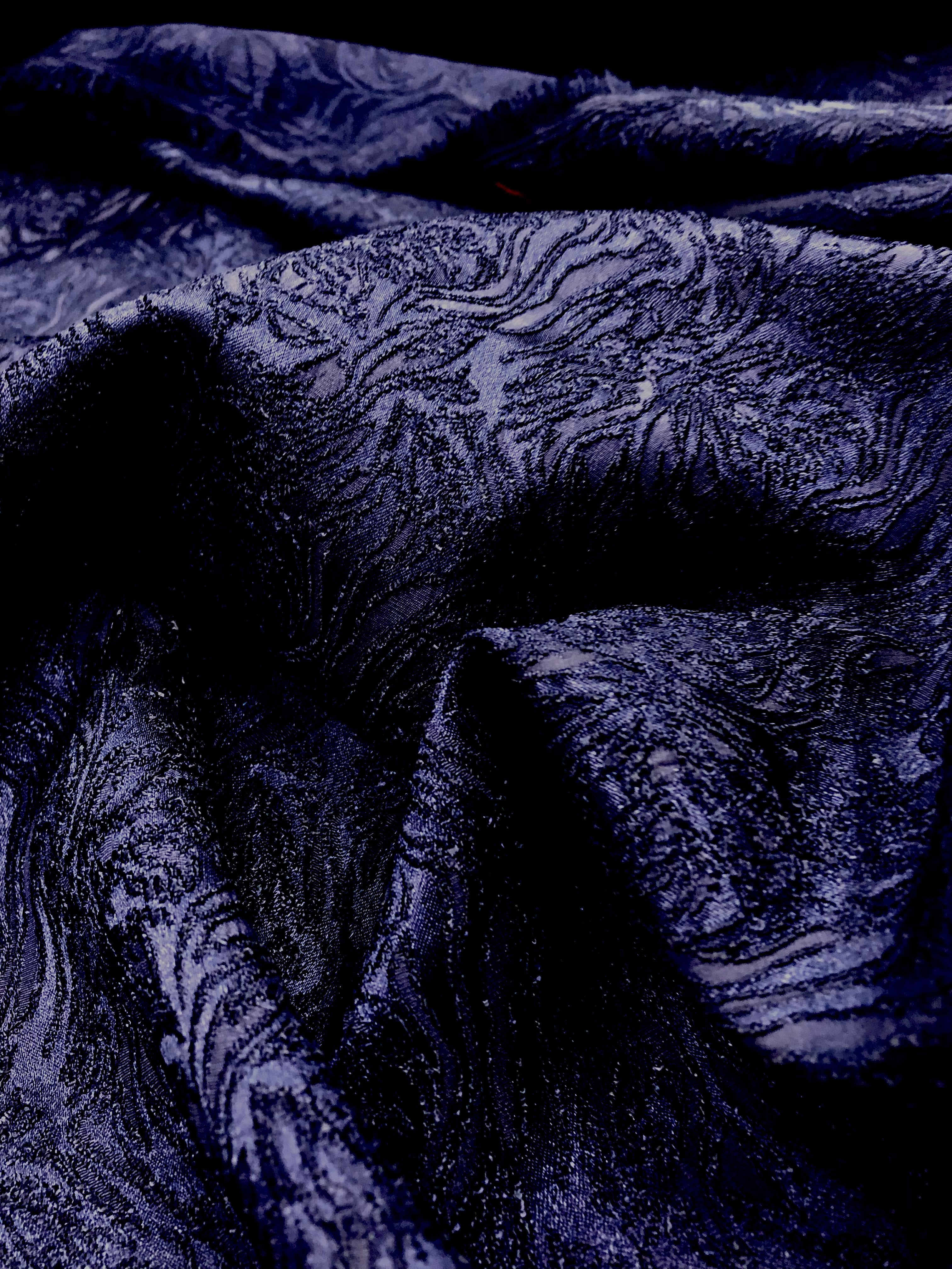 Priced per yard. Navy stretch brocade. 57-inches wide.