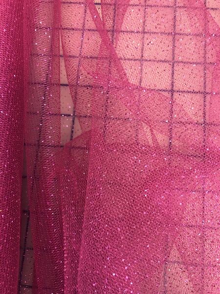 Priced per yard. Fuchsia tiny-dot glitter tulle, 58-inches wide. Some stretch across the width of the tulle. No stretch length-wise.