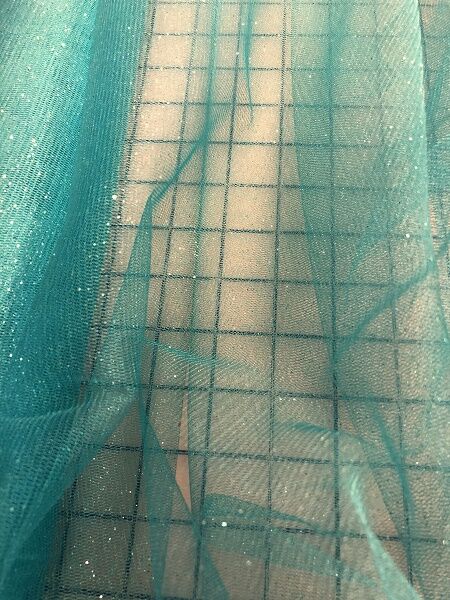 Priced per yard. Jade / Aqua tiny-dot glitter tulle, 58-inches wide. Some stretch across the width of the tulle. No stretch length-wise.