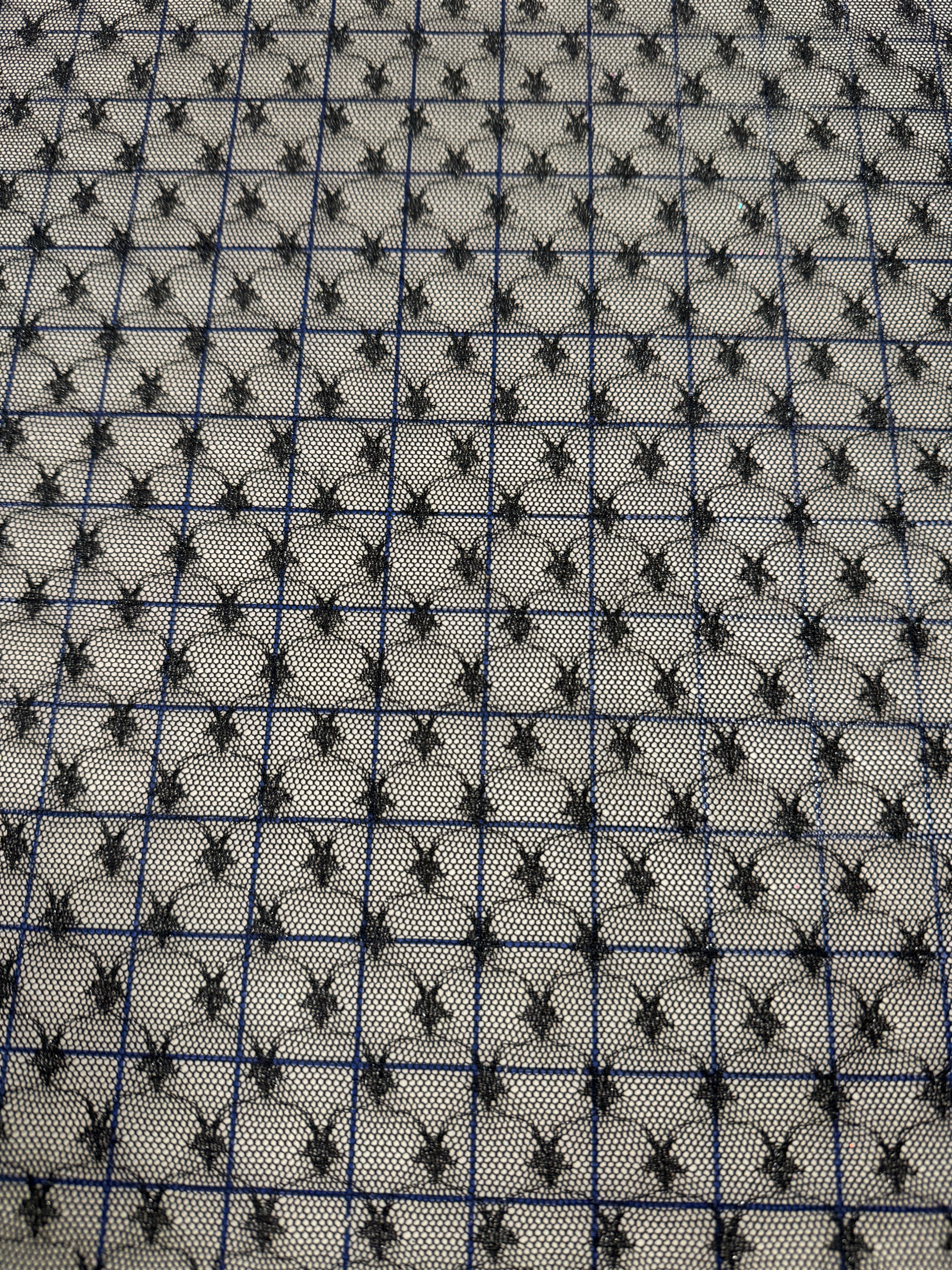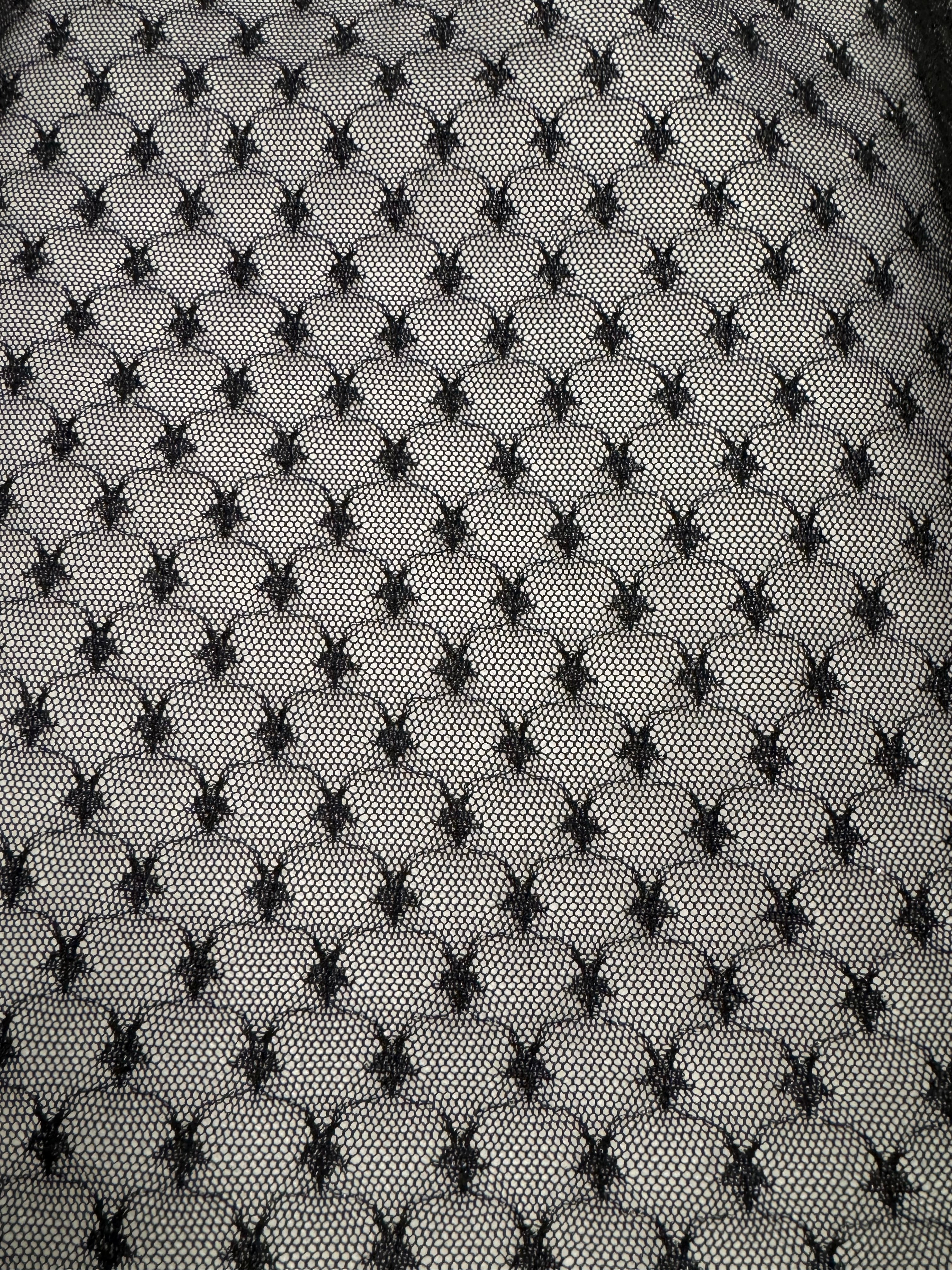 Priced per yard. Black stretch lace with smallall-over design and light tiny-dot black sparkle. 58-inches wide.