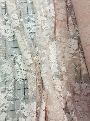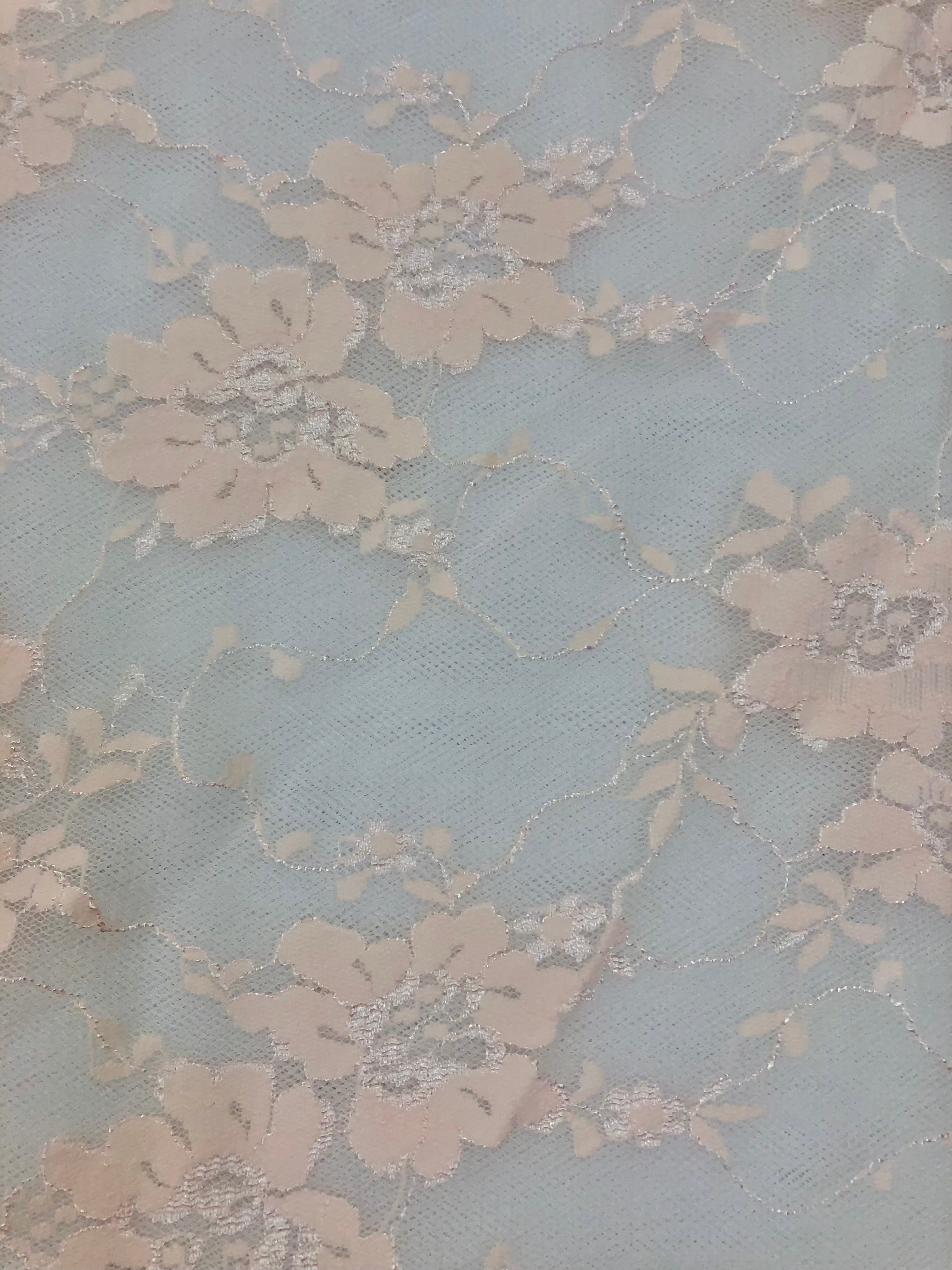 Priced per yard. European Pink (very pale peachy-pink) stretch lace, 58-inches wide.