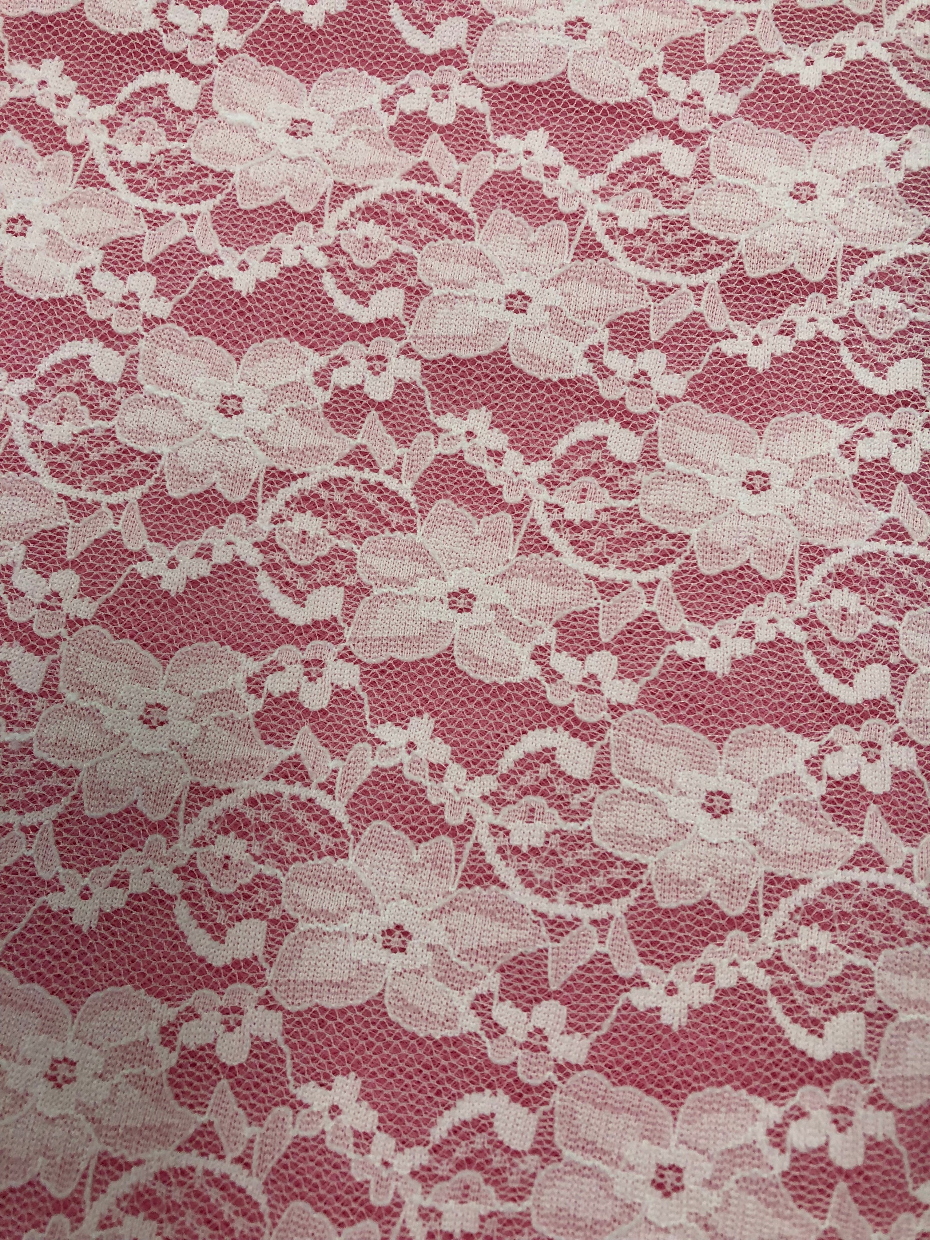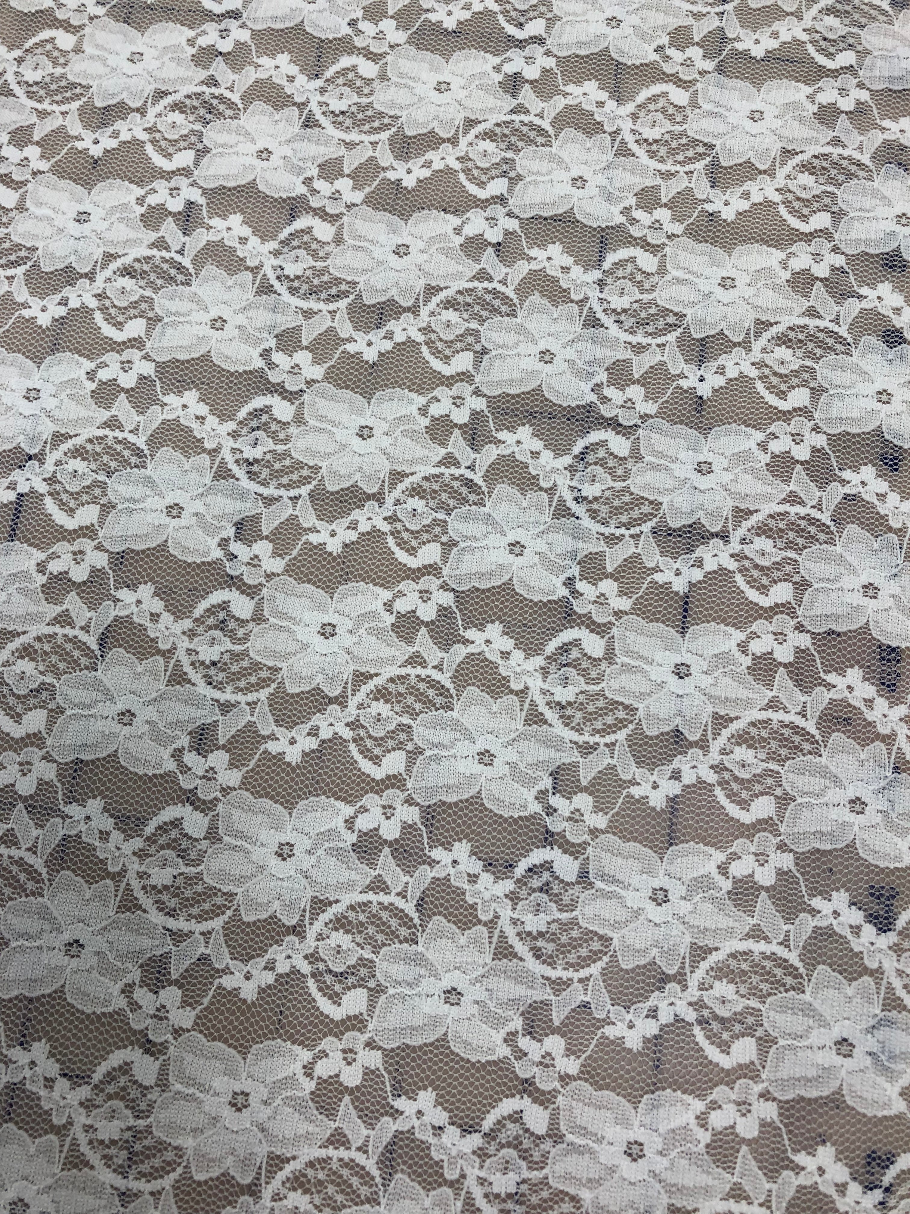 Priced per yard. White stretch lace, 58-inches wide.