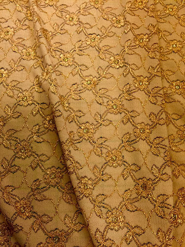 Priced per yard. Golden fancy stretch lace. 60-inches wide.