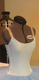Course Description: This class was developed for those who are interested in making romantic tutus using stretch materials but want to preserve more of the polished, professional quality “look” than the stretch tutus and children’s tutus currently available on the market today. You will learn to make a beautiful princess-seamed camisole style stretch upper with a very low-cut back that enhances the beauty of the dancer’s lines. Stretch fabric used in this class is a beautiful stretch velvet, offered in your choice of several colors. Choice of romantic skirt styles – romantic, petaled flower style, or tapered “High/Low” style. Thanks to TutuSchool Alumni Jill Meuris for modeling a romantic style during her class! See second picture for a close up of the princess-seamed style top.