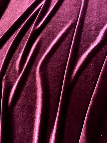 Priced per yard. Burgundy stretch velvet, 60-inches wide. Perfect for leotards, stretch tutus, and many other costumes. 90% polyester, 10% Elastano. Weight = 35 grams per yard.