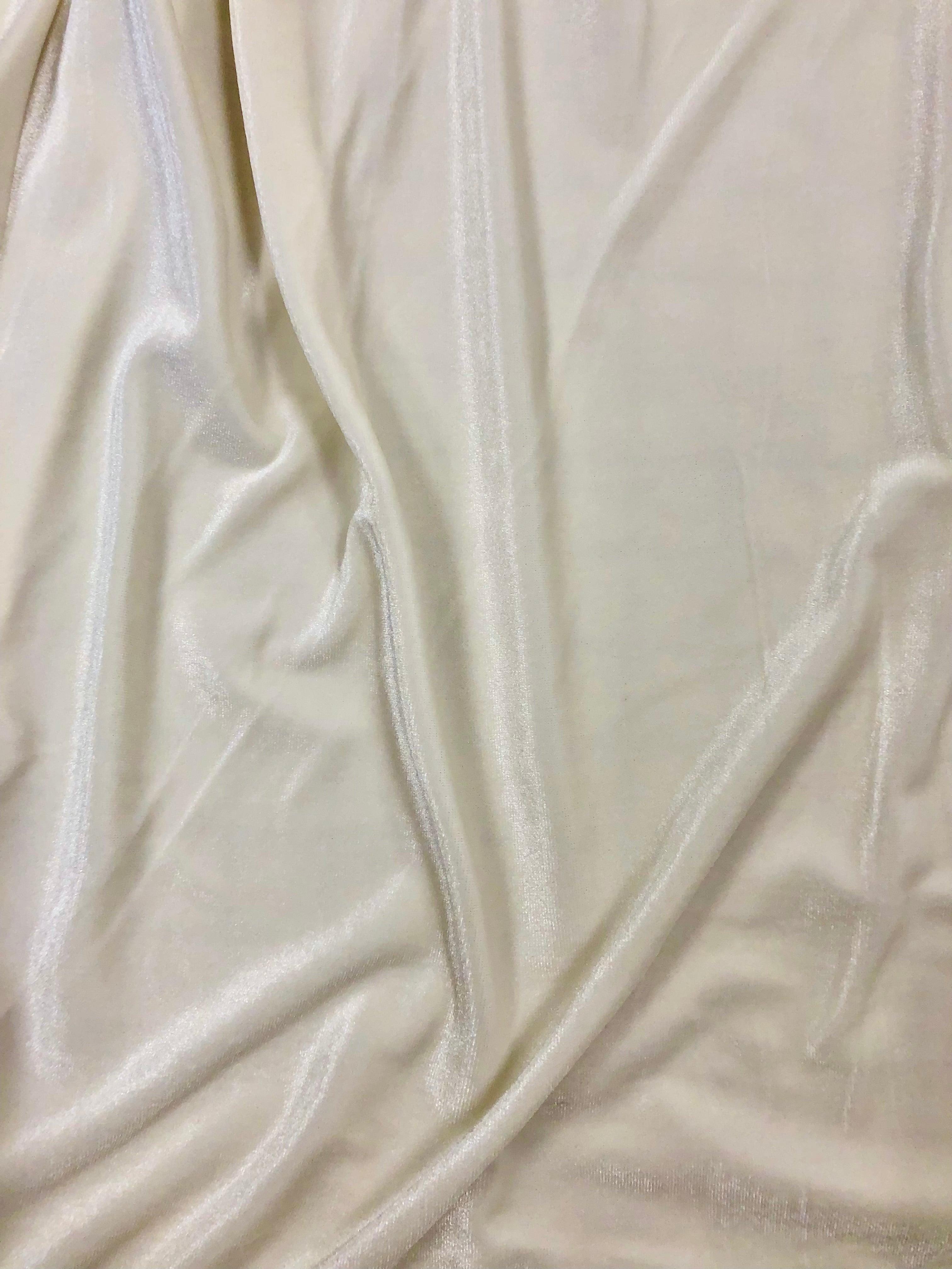 Priced per yard. Ivory stretch velvet, 60-inches wide. Perfect for leotards, stretch tutus, and many other costumes. 90% polyester, 10% Elastano. Weight = 35 grams per yard.