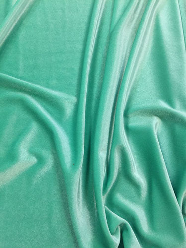 Priced per yard. Mint stretch velvet, 60-inches wide. Perfect for leotards, stretch tutus, and many other costumes. 90% polyester, 10% Elastano. Weight = 35 grams per yard.