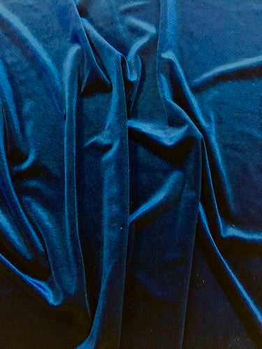 Priced per yard. Royal Blue stretch velvet, 60-inches wide. Perfect for leotards, stretch tutus, and many other costumes. 90% polyester, 10% Elastano. Weight = 35 grams per yard.