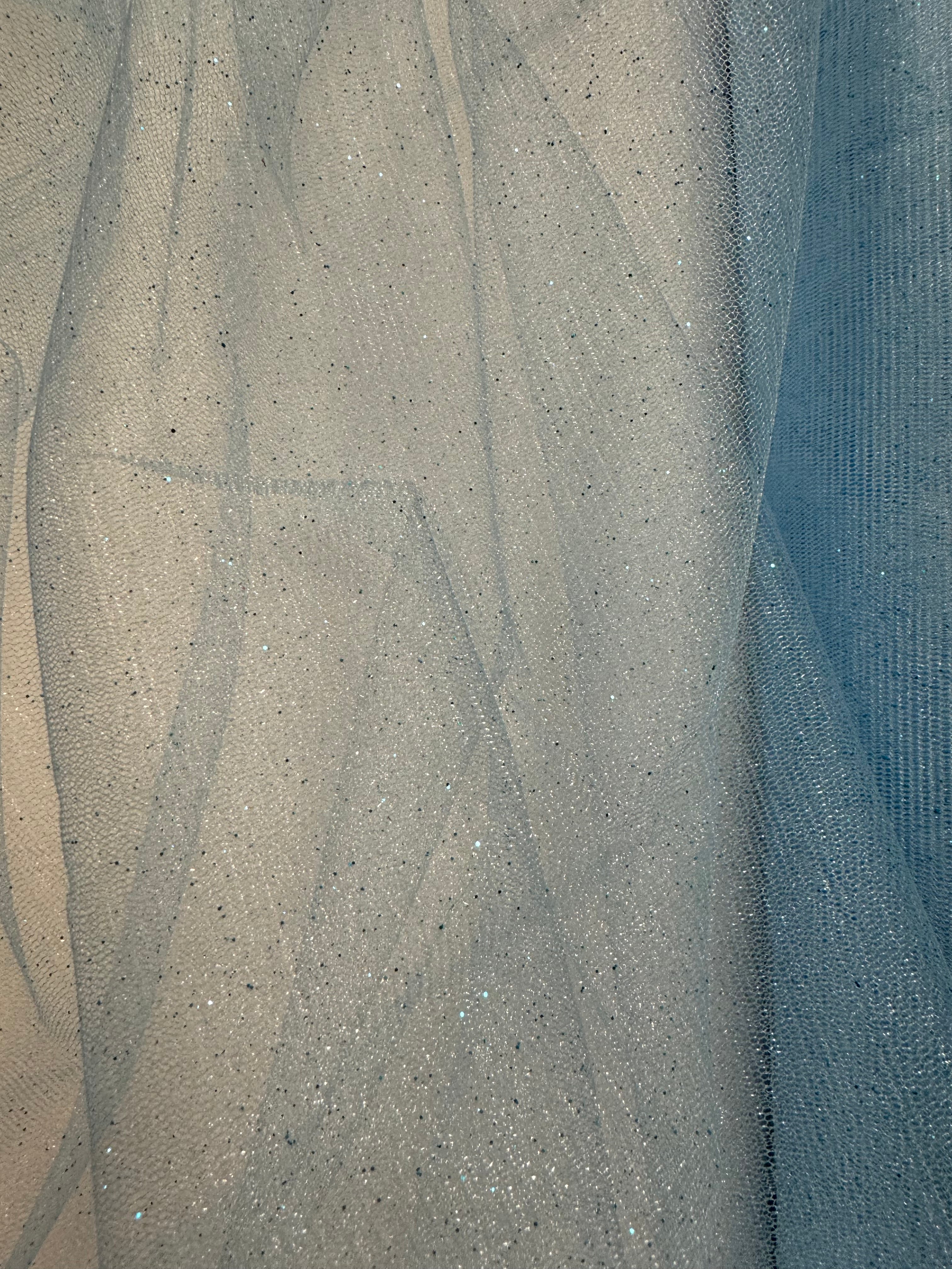 Priced per yard. Beautiful, tiny-dot light blue glitter tulle. 58/60-inches wide. Slight stretch across the width.