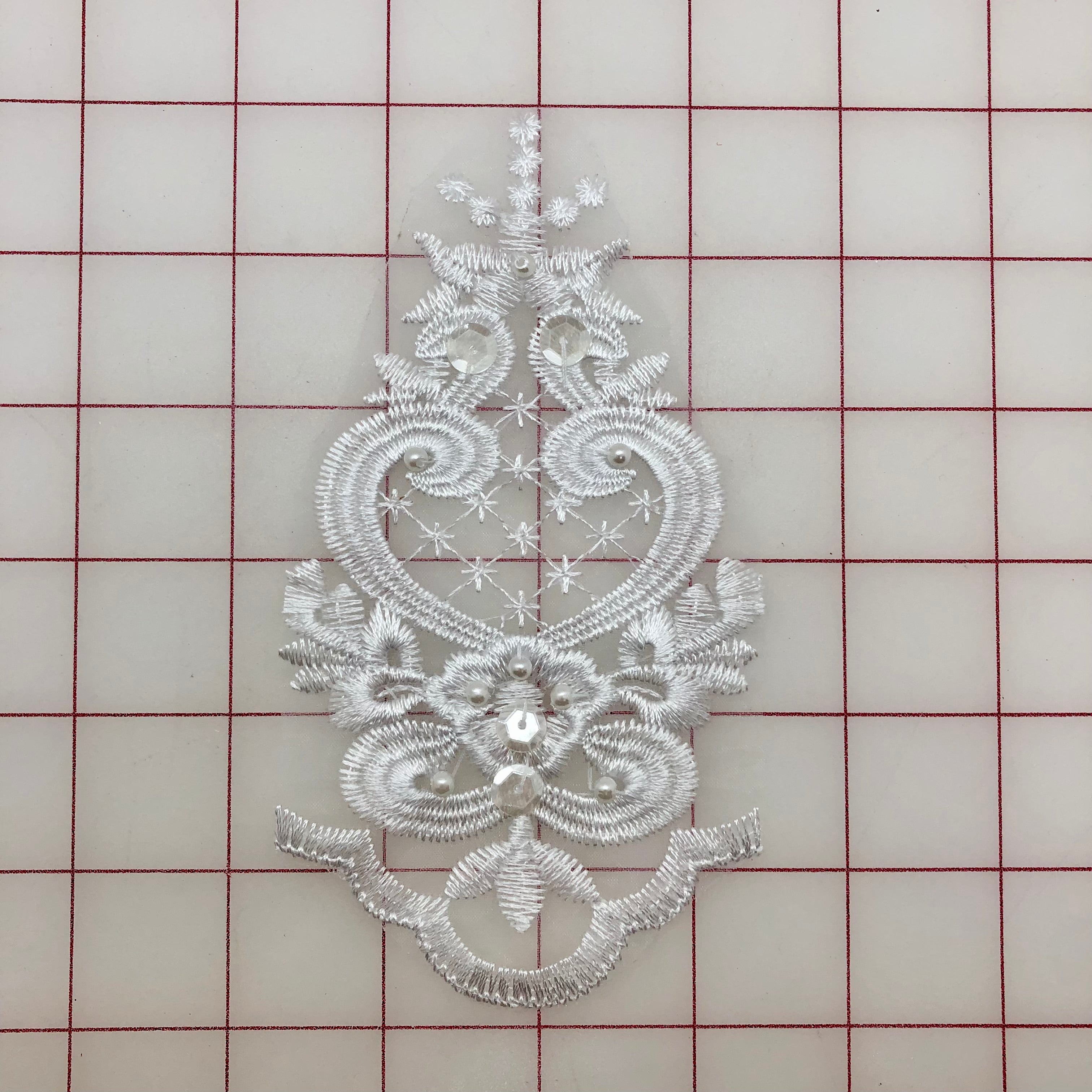 Priced per 3/4-yard piece. White beaded and sequined embroidered trim. 6-inches at widest point. Lightweight!