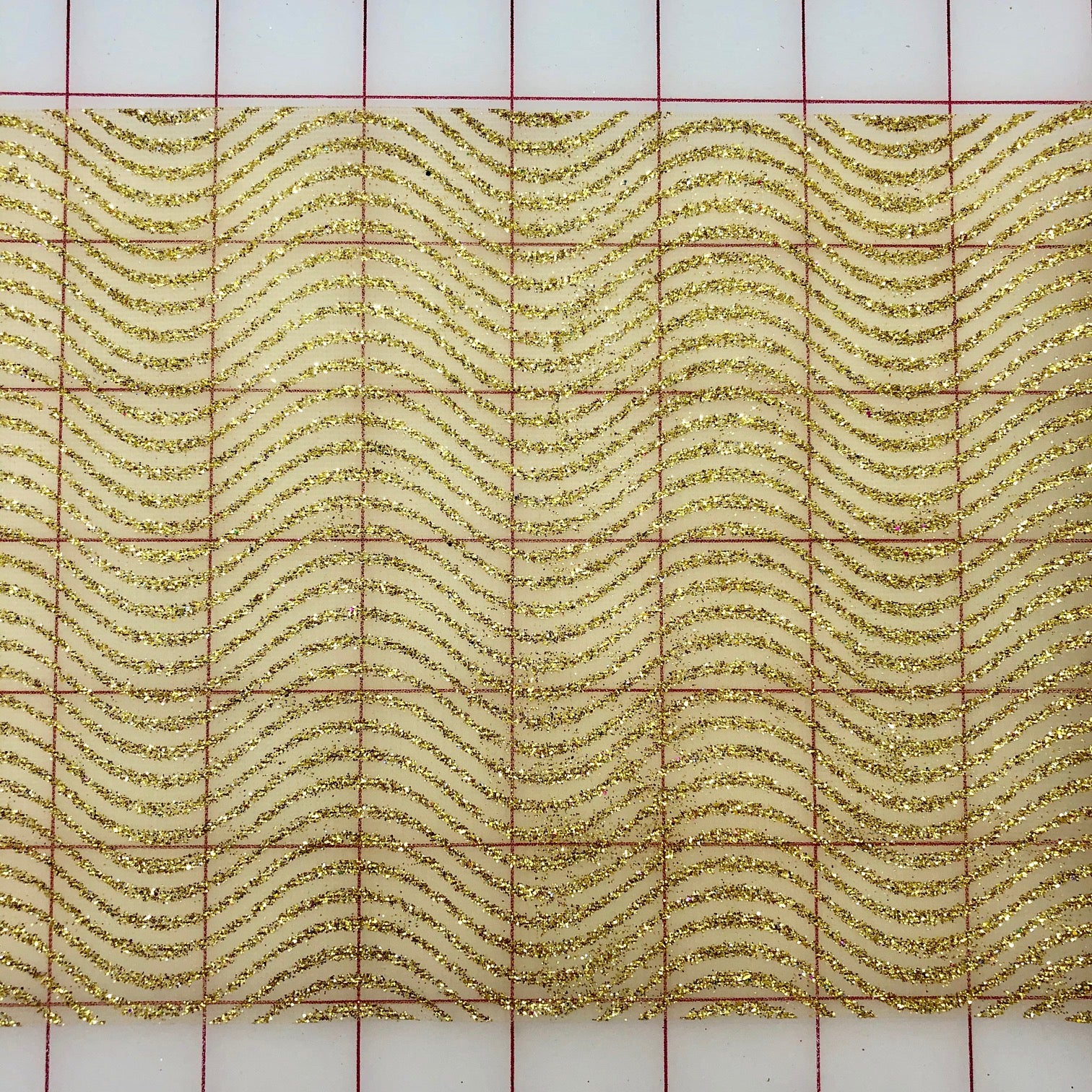 Priced per yard. Beautiful, gold glitter on organza trim. Perfect, lightweight trim for many costumes. 6-inches wide.