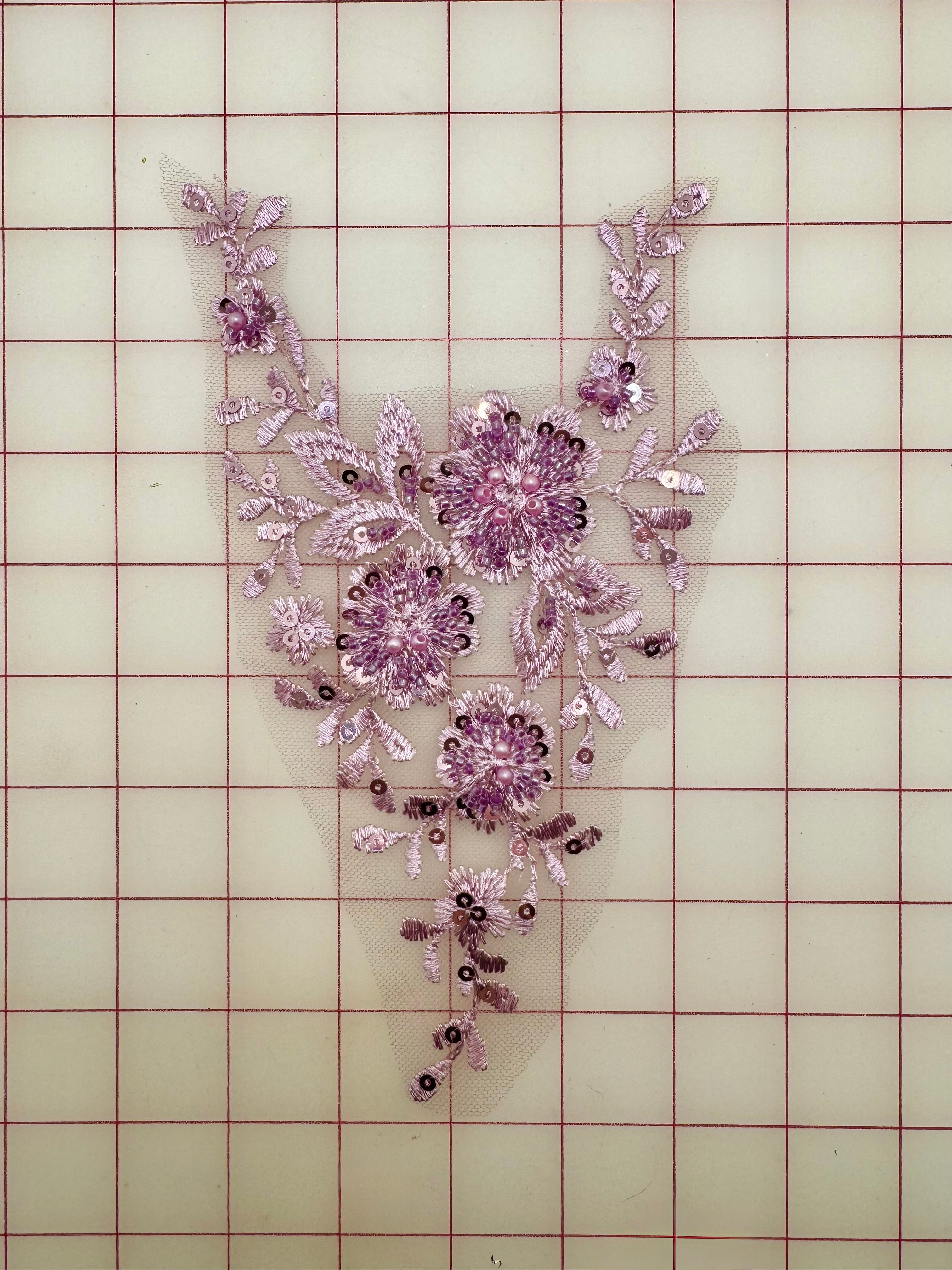 Priced per piece. Gorgeous lilac beaded and embroidered lace motifs.