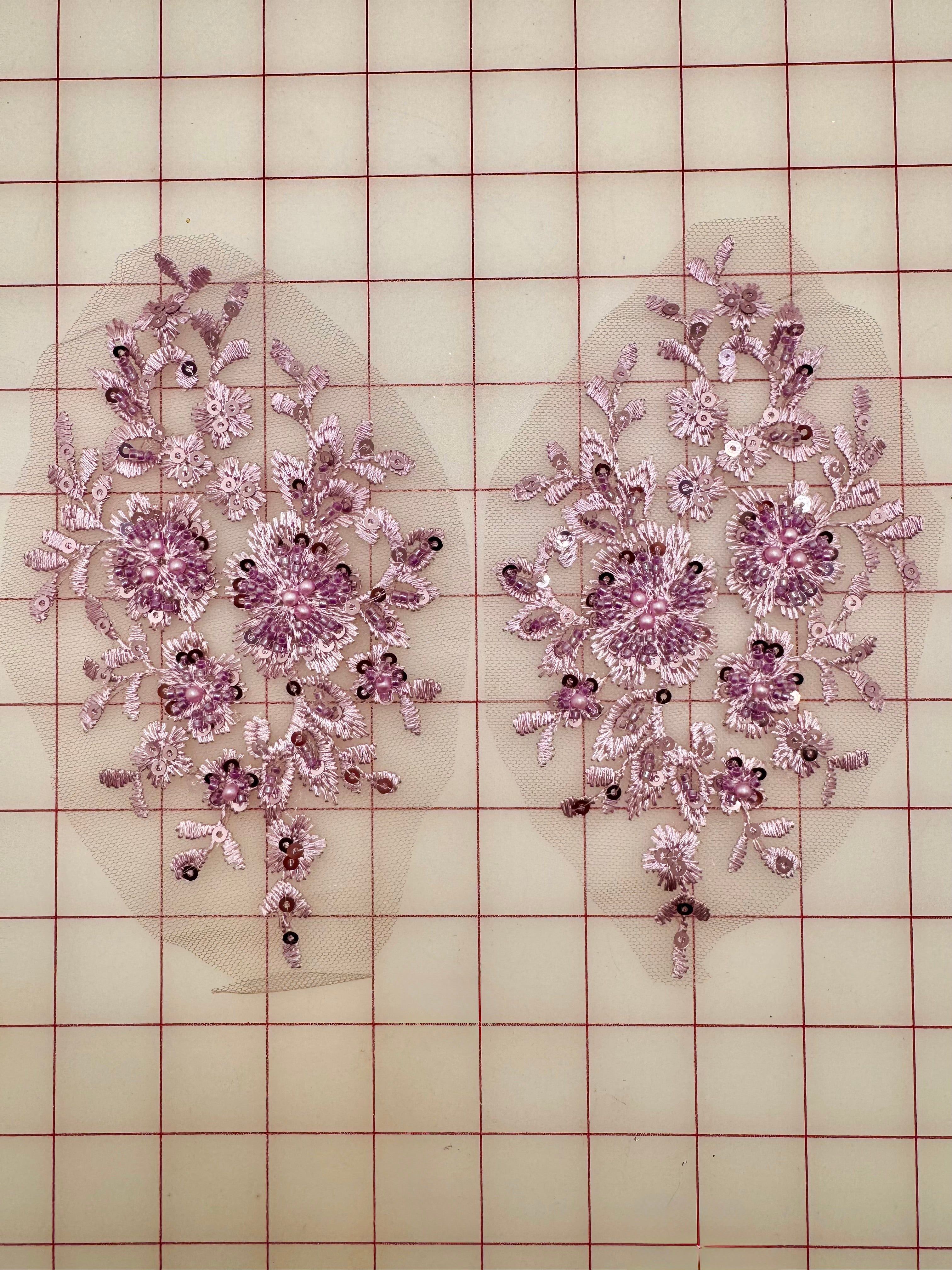 Priced per pair. Gorgeous lilac beaded and embroidered lace motifs.