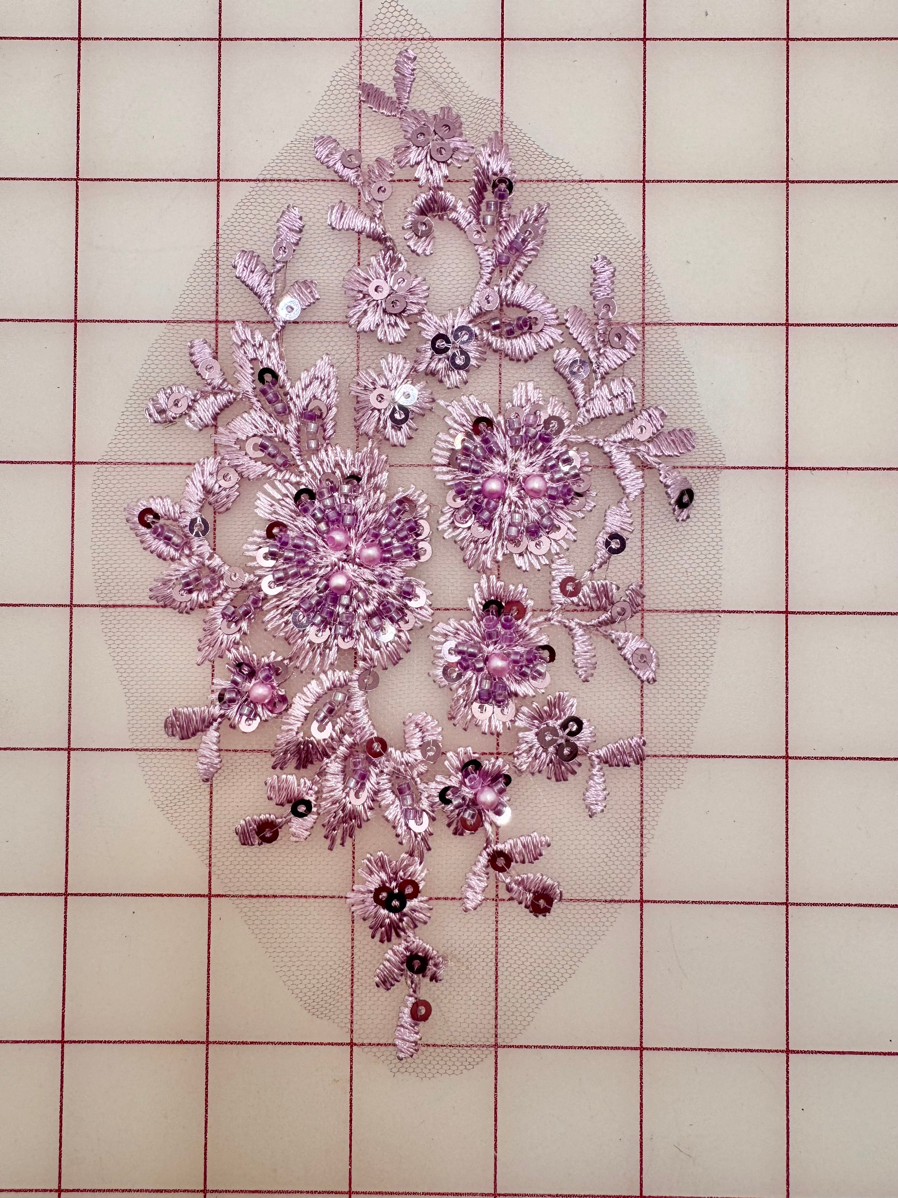 Priced per piece. Gorgeous lilac beaded and embroidered lace motif.