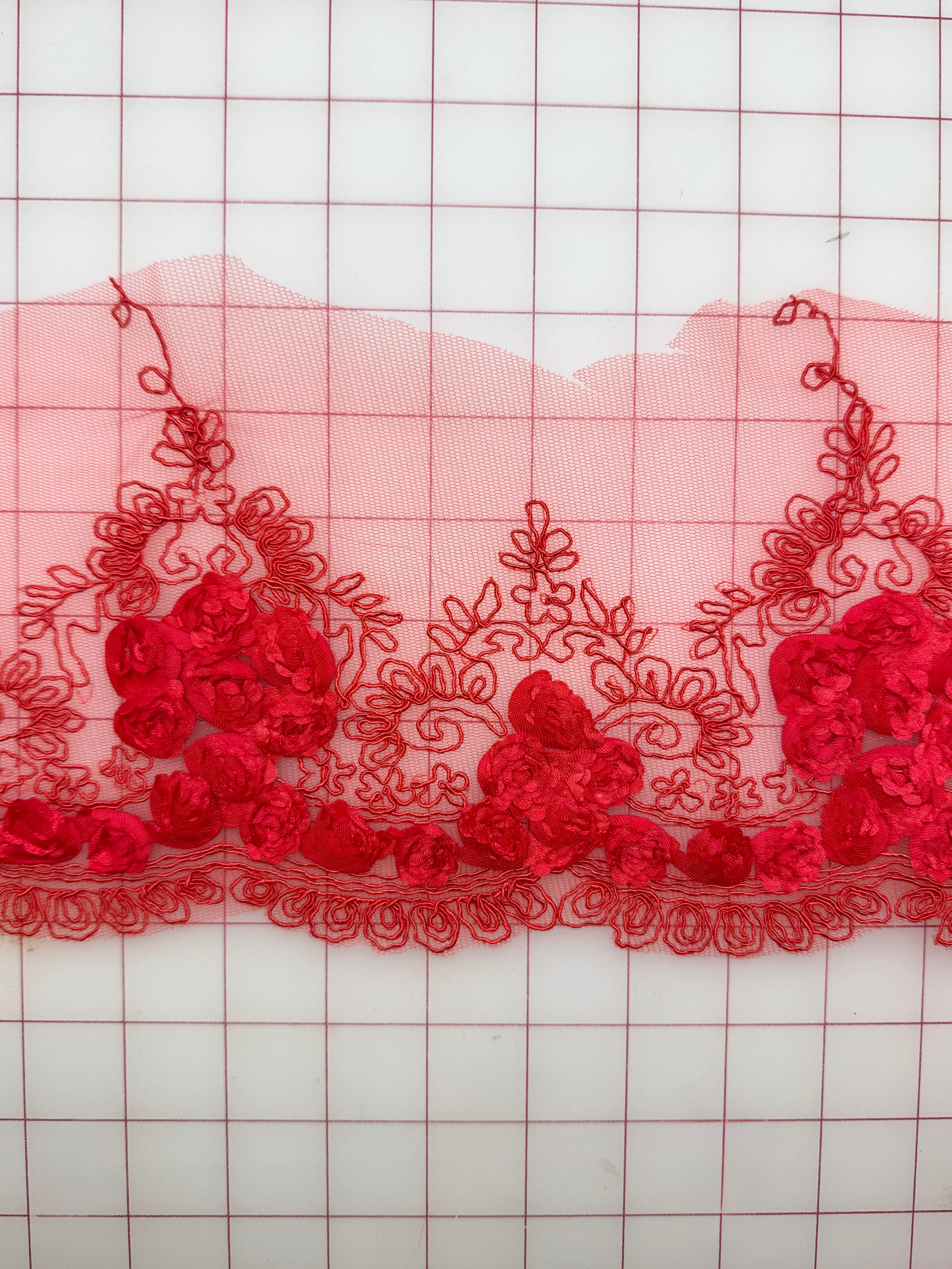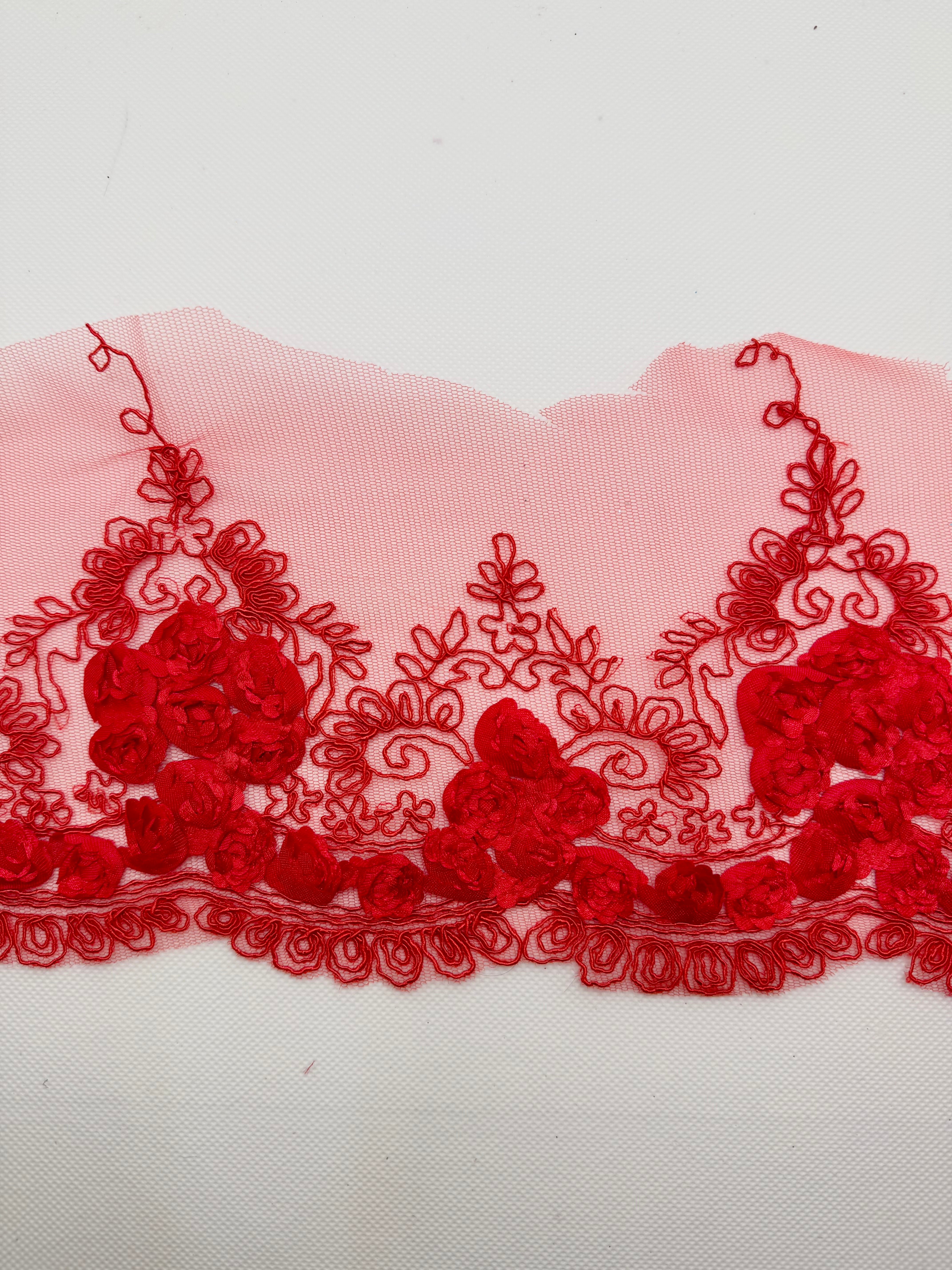 Priced per 1-yard piece. Beautiful red lace border trim with 3D flowers. Very lightweight.