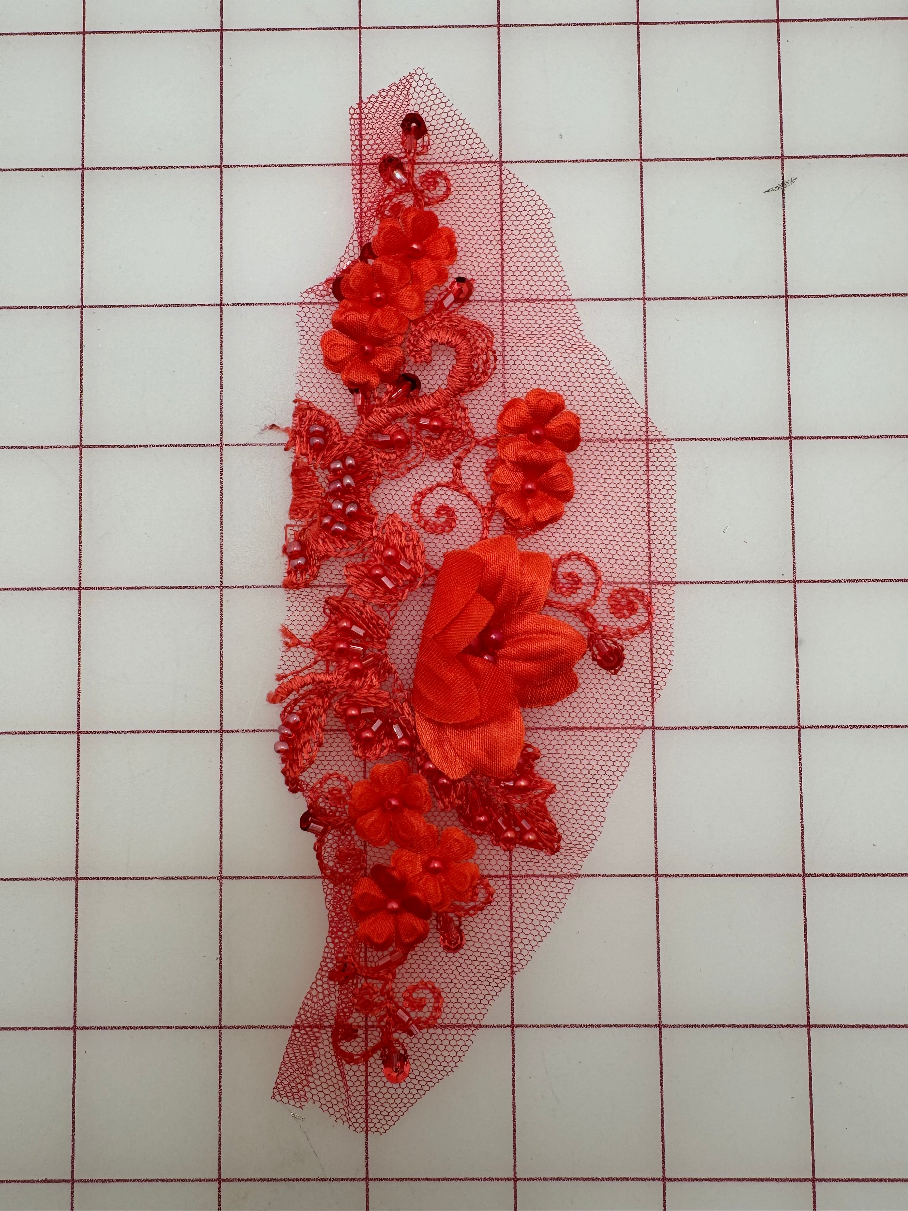 Priced per piece. Stunning, red, beaded, embroidered lace.