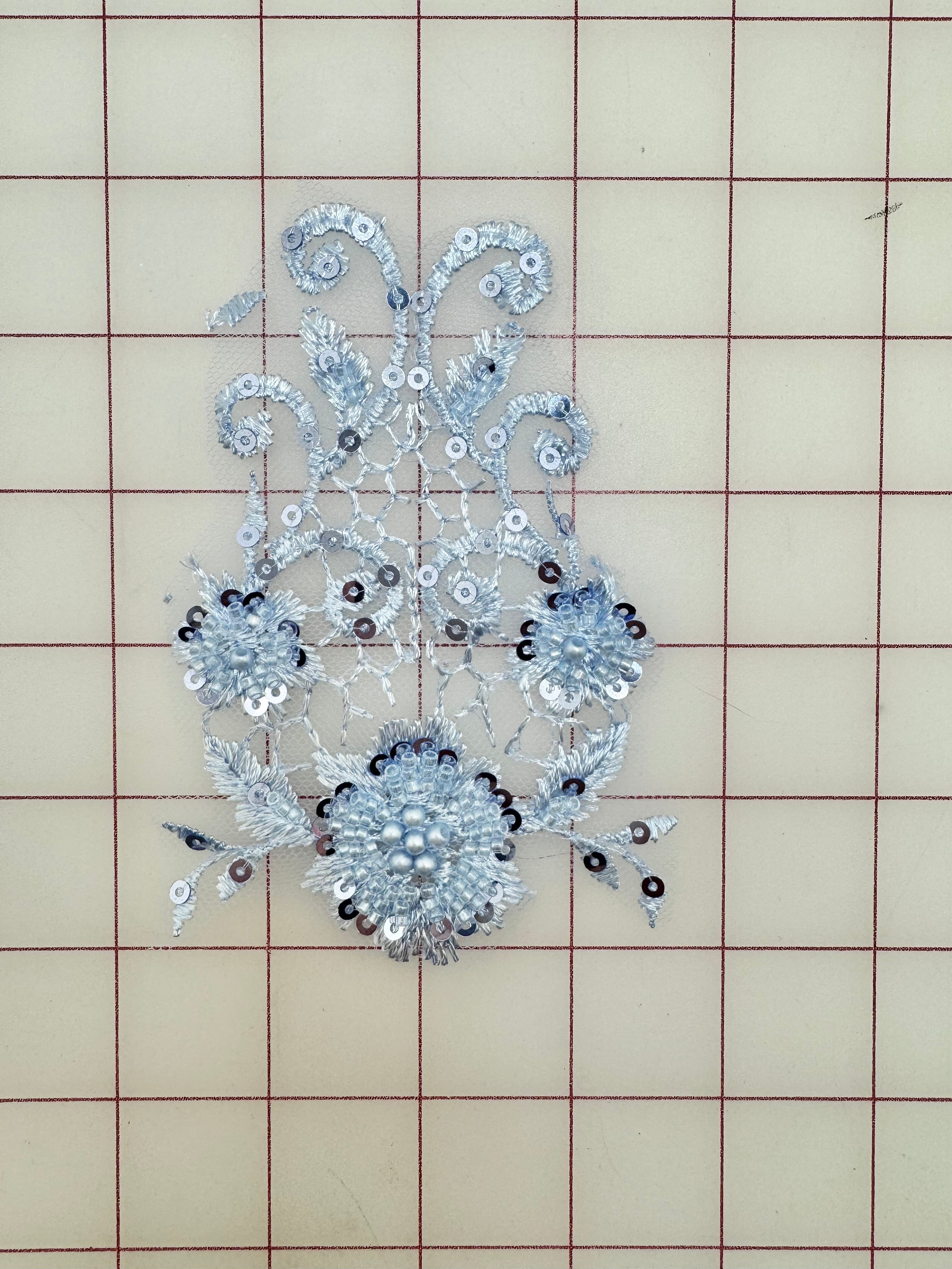 Priced per piece.  Light blue, sequined, embroidered applique.