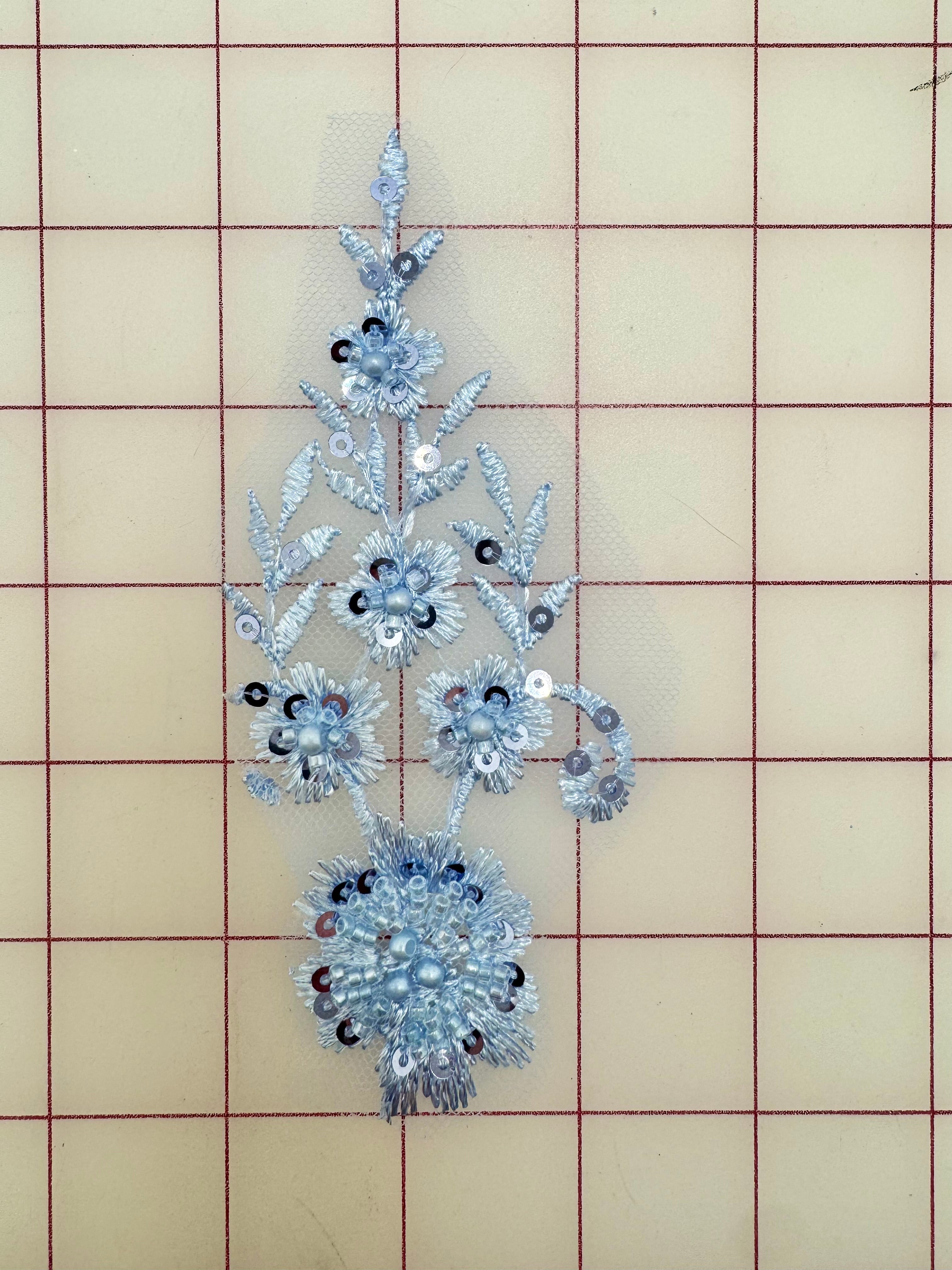 Priced per piece. Light blue, sequined, embroidered applique.