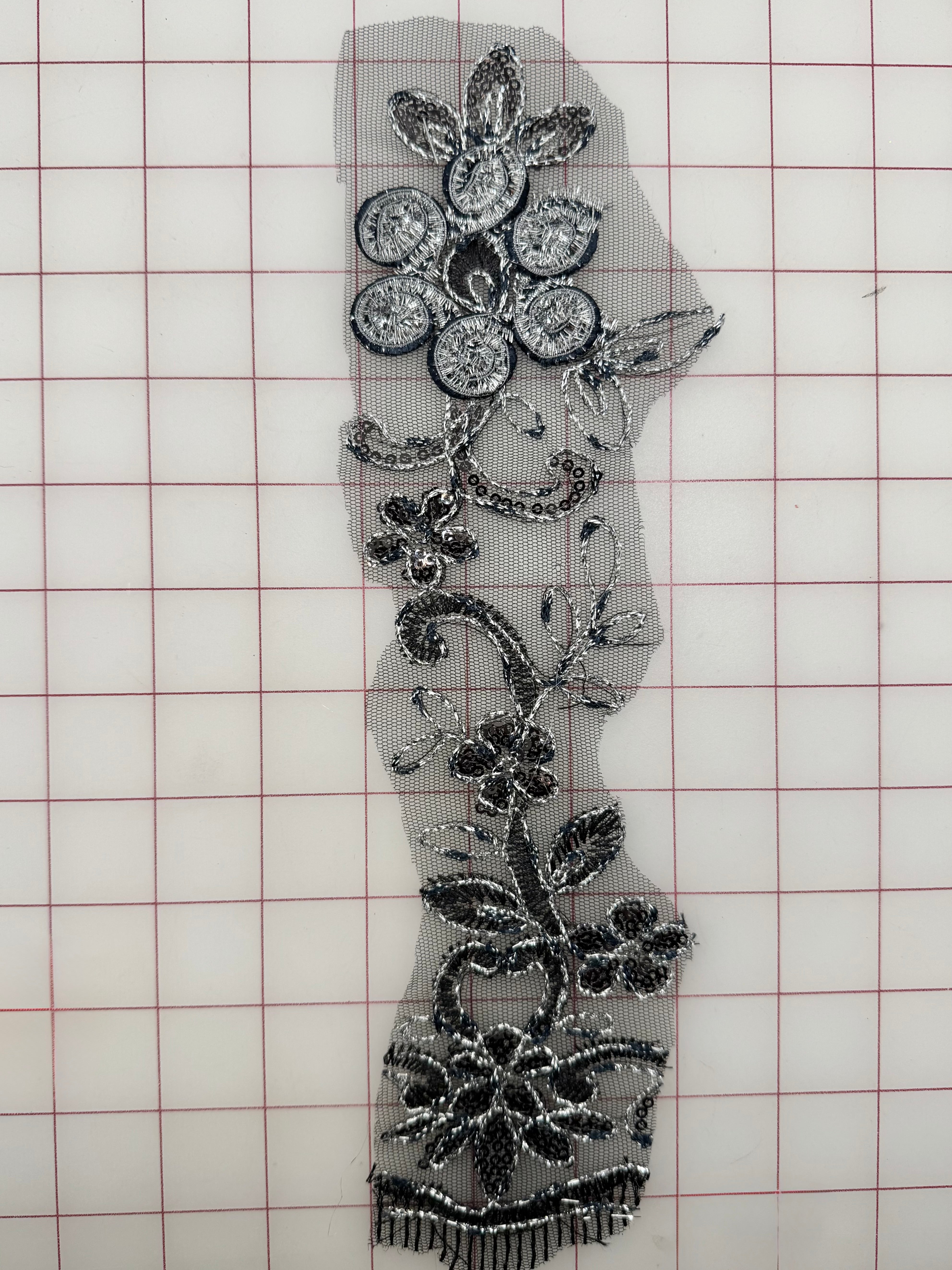 Priced per piece. Elegant, black and silver vintage trim. .12-inches long by 3-inches wide.