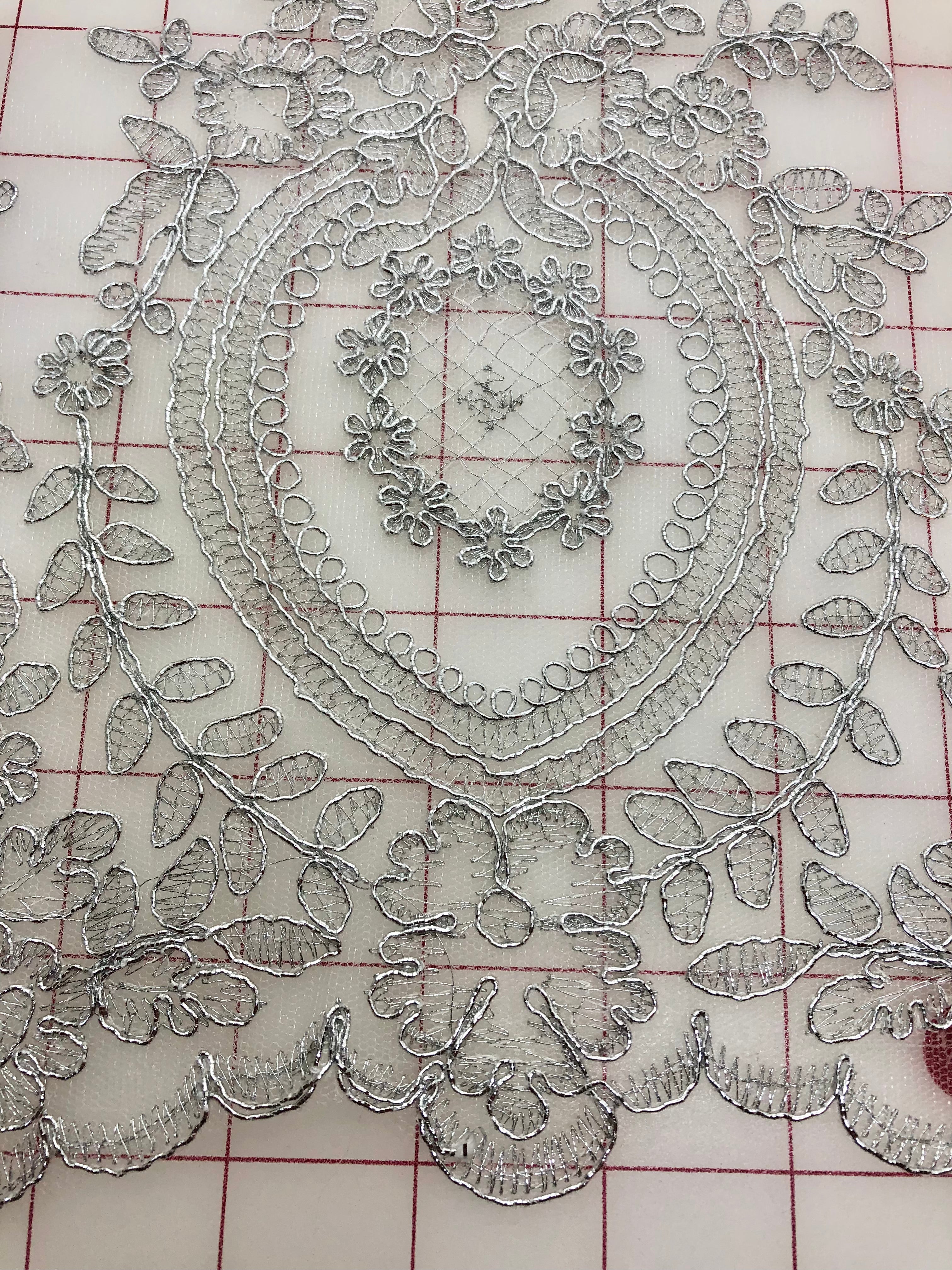 Priced per piece. Beautiful, lightweight, silver metallic corded lace motifs.