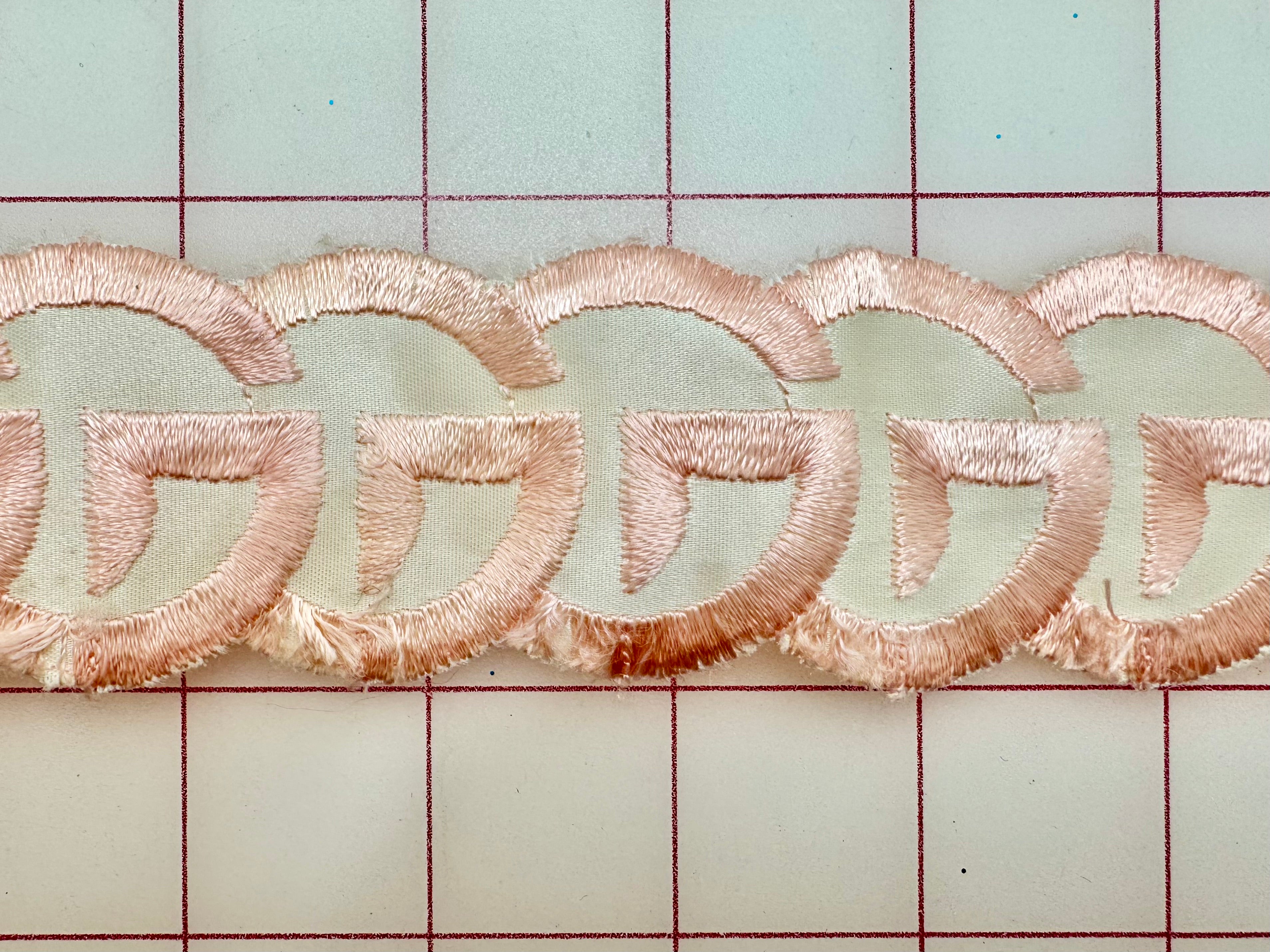 Priced per 1.75-yard piece. Beautiful, vintage, peach embroidered on ivory satin ribbon trim. Approximately 2-inches wide.