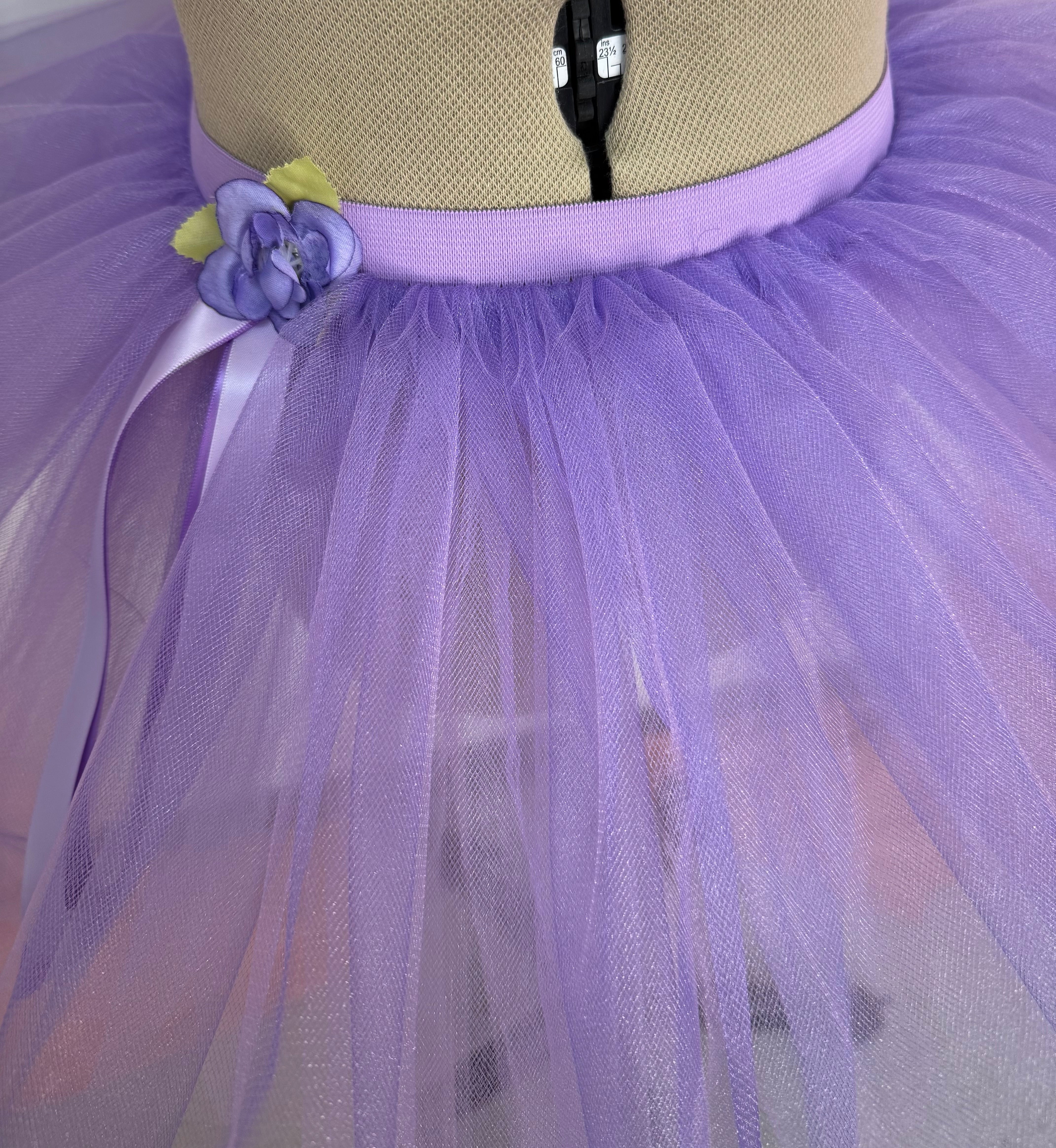 Priced per tutu. Adorable, four-layer, pull-on tutus made of soft lilac tulle, embellished with ribbons and a flower. Great for performances, Halloween, and for playing. Built on a sturdy dyed-to-match elastic band. Made to be worn over a leotard.
