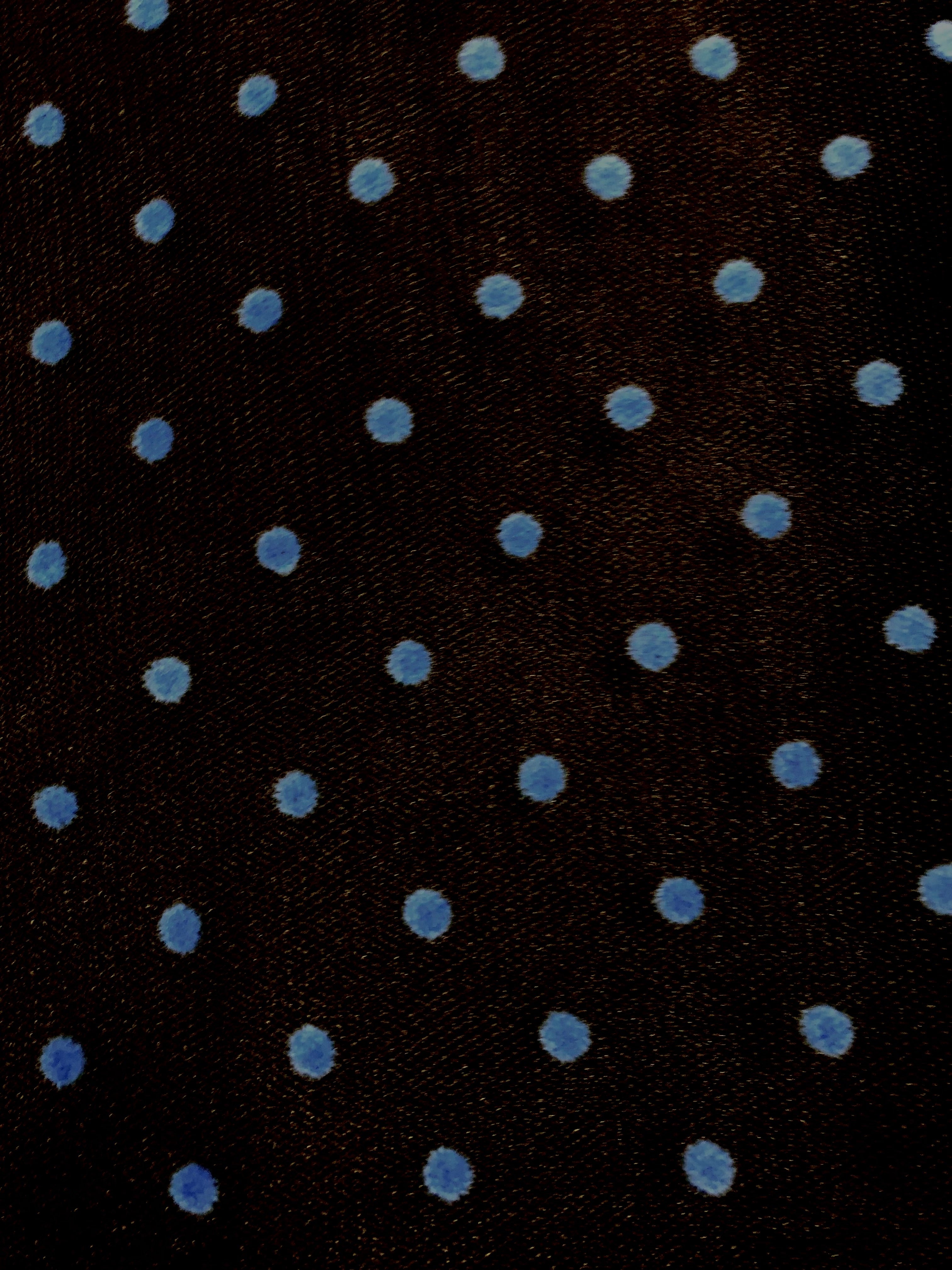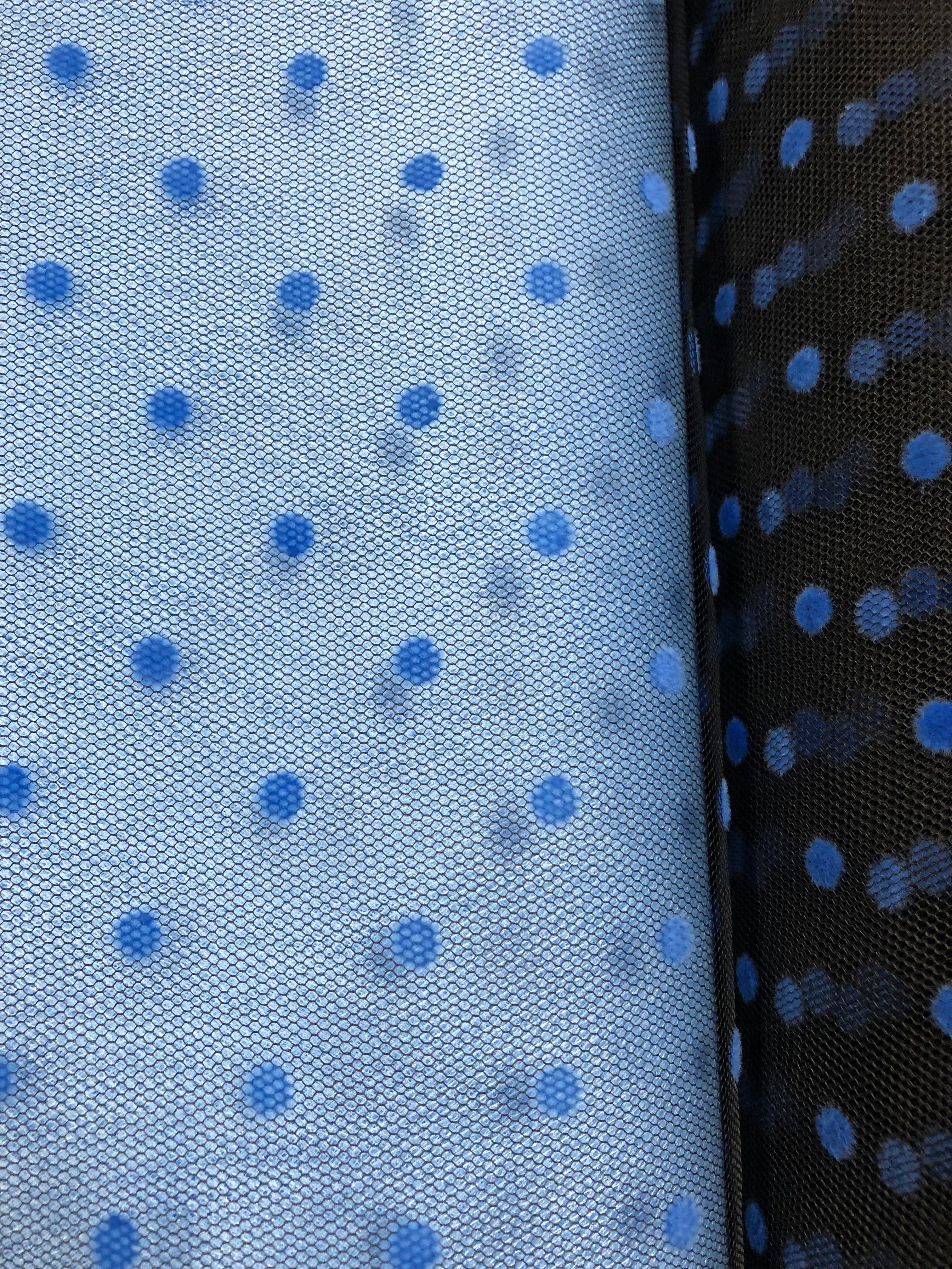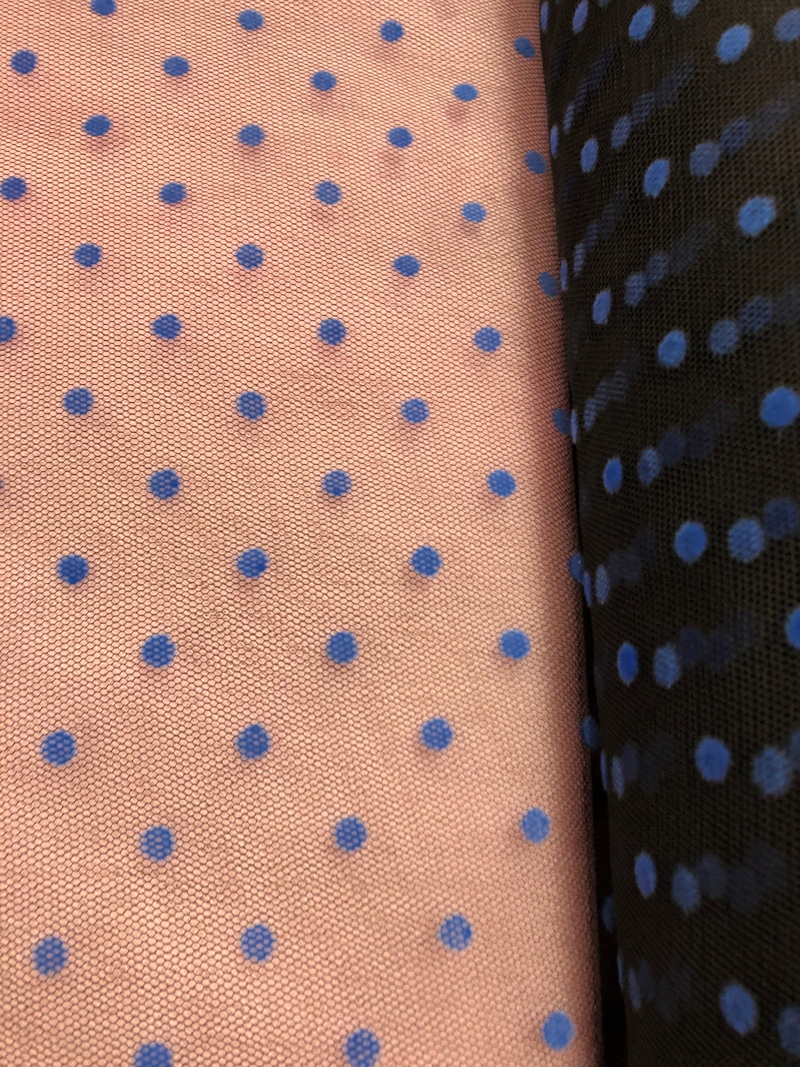 Priced per yard. Black crinoline tutu net with small blue flocked polka dots. Perfect for a fun rehearsal tutu, a doll from the Nutcracker, a contemporary ballet, and many other costumes.