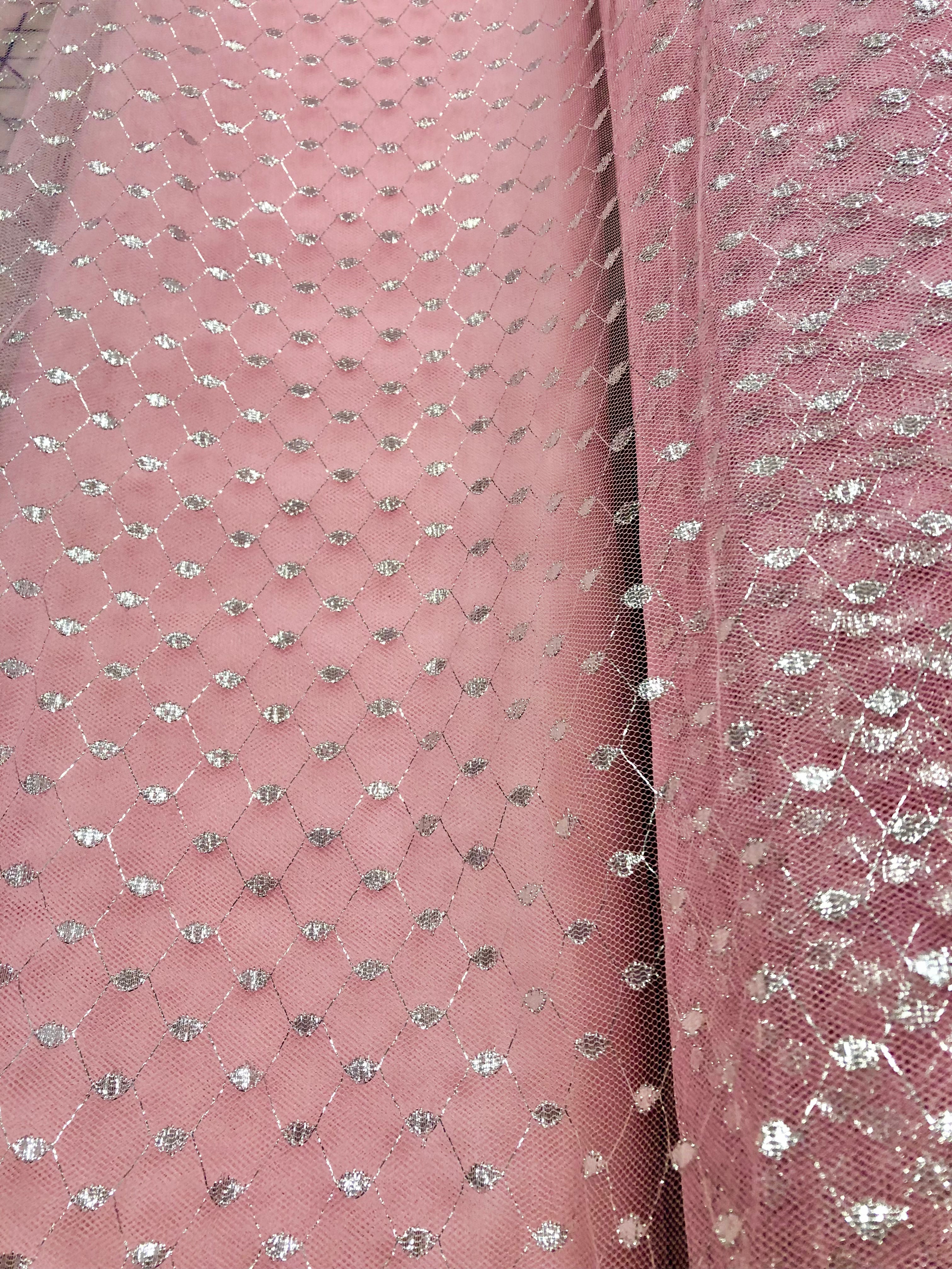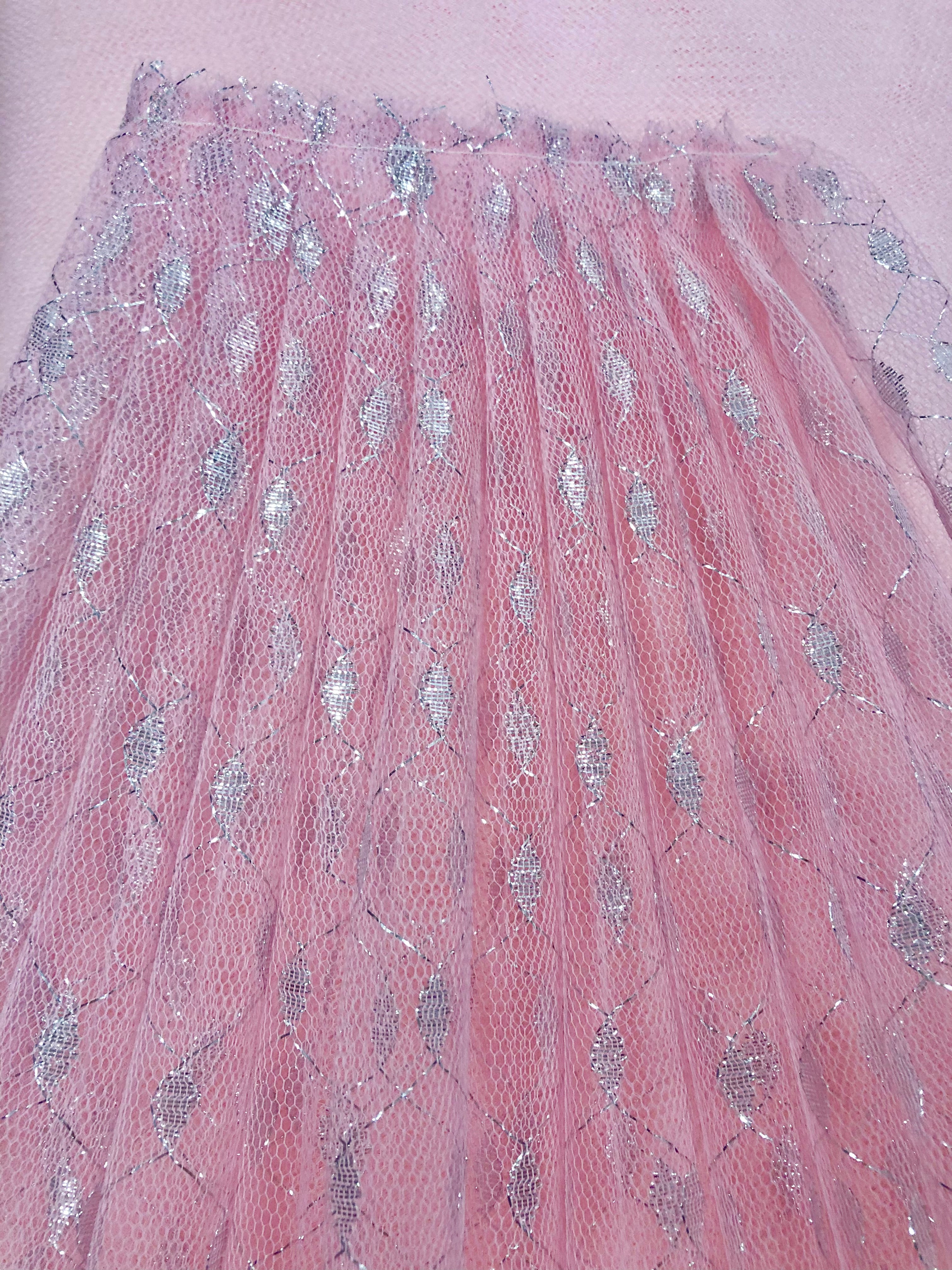 Priced per yard. Stiff, Lt Pink tutu net with silver metallic design throughout.