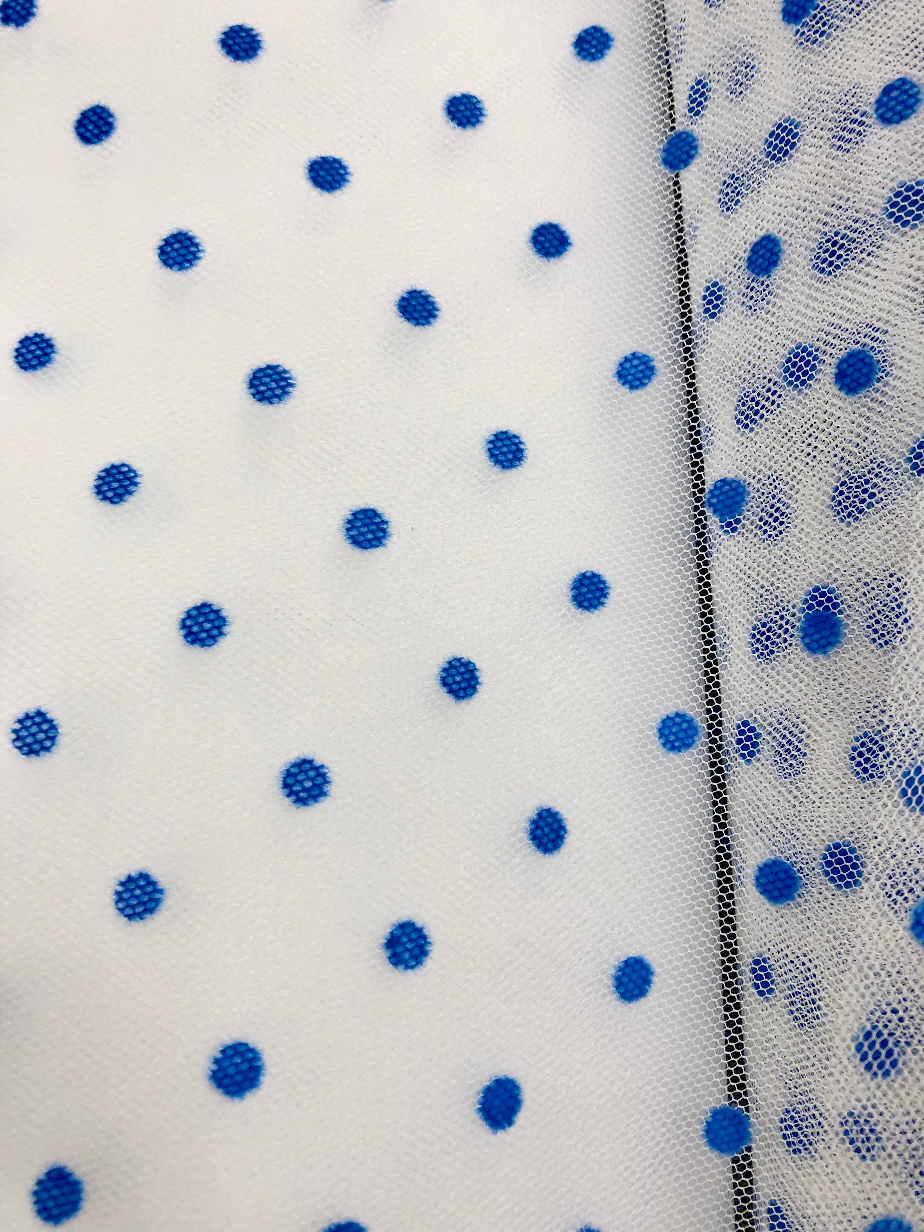 Priced per yard. White crinoline tutu net with small blue flocked polka dots. Perfect for a fun rehearsal tutu, a doll from the Nutcracker, a contemporary ballet, and many other costumes.