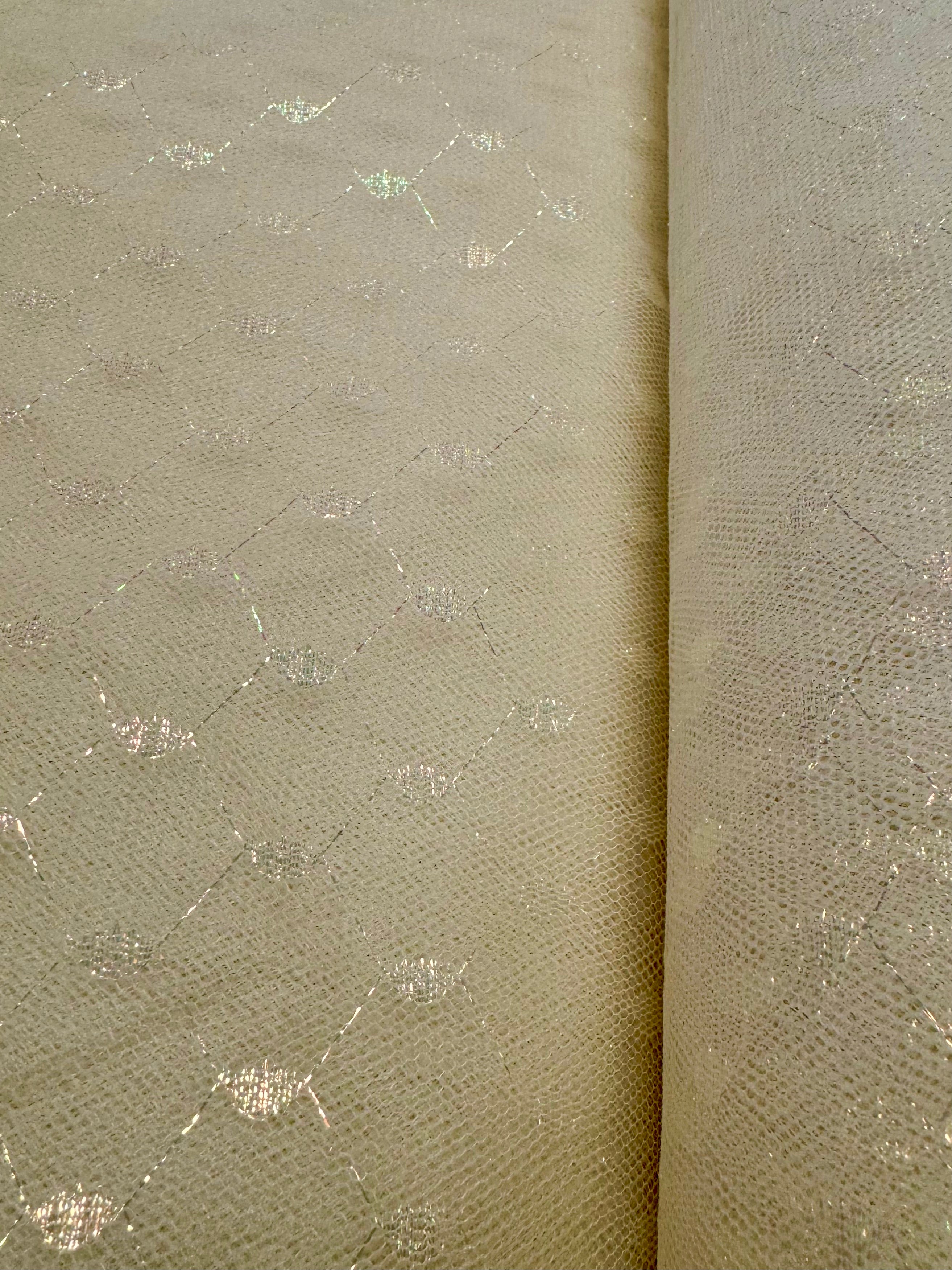 Priced per yard. Ivory, soft tutu net with golden iridescent metallic design throughout.Special Purchase. 56-inches wide.