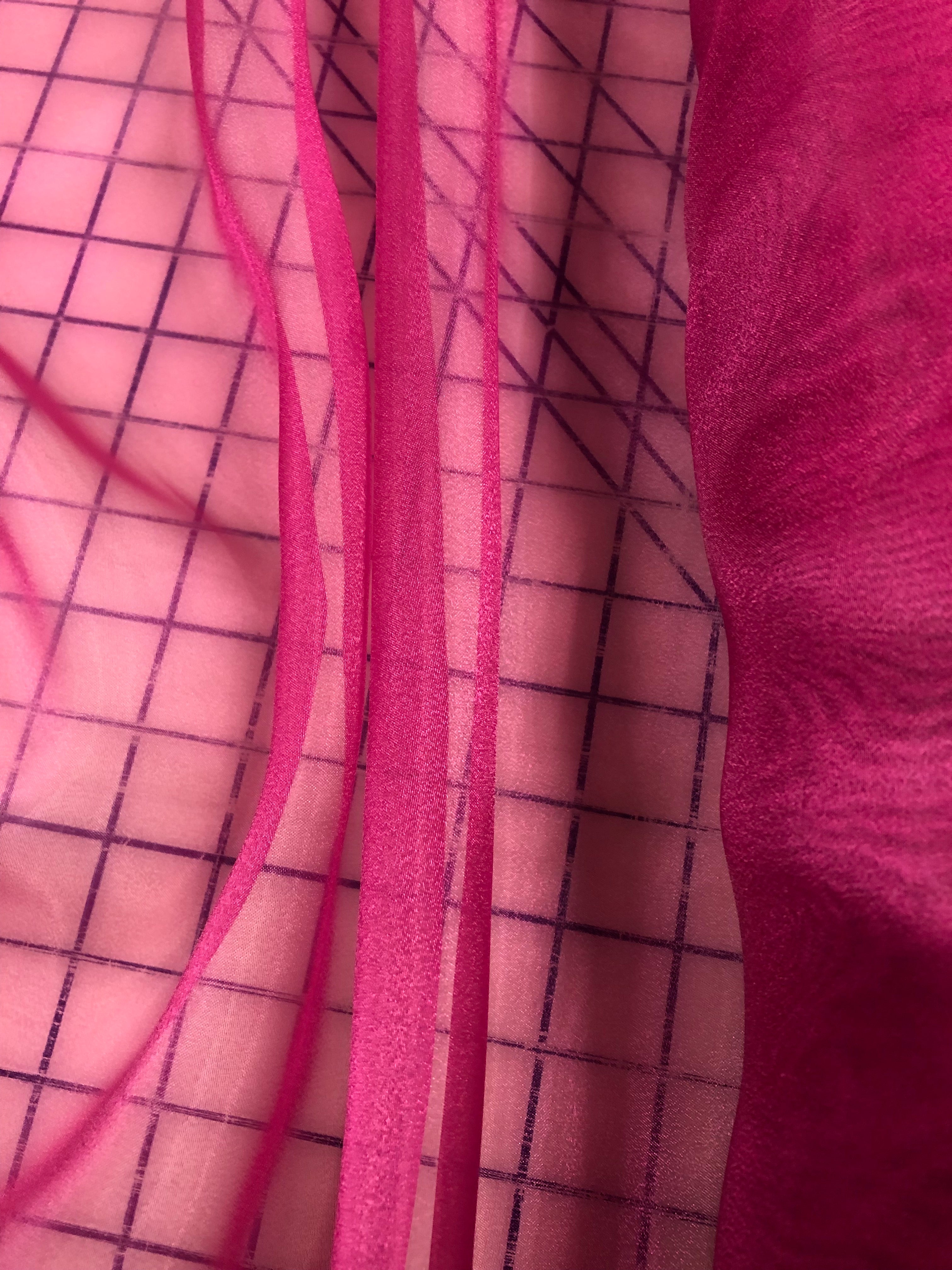 Priced per yard. 100% polyester Twinkle Organza. Beautiful fabric! 58-60-inches wide. Perfect for tiered Spanish-style skirts, and other ruffled skirts. Very silk-like look! Magenta.