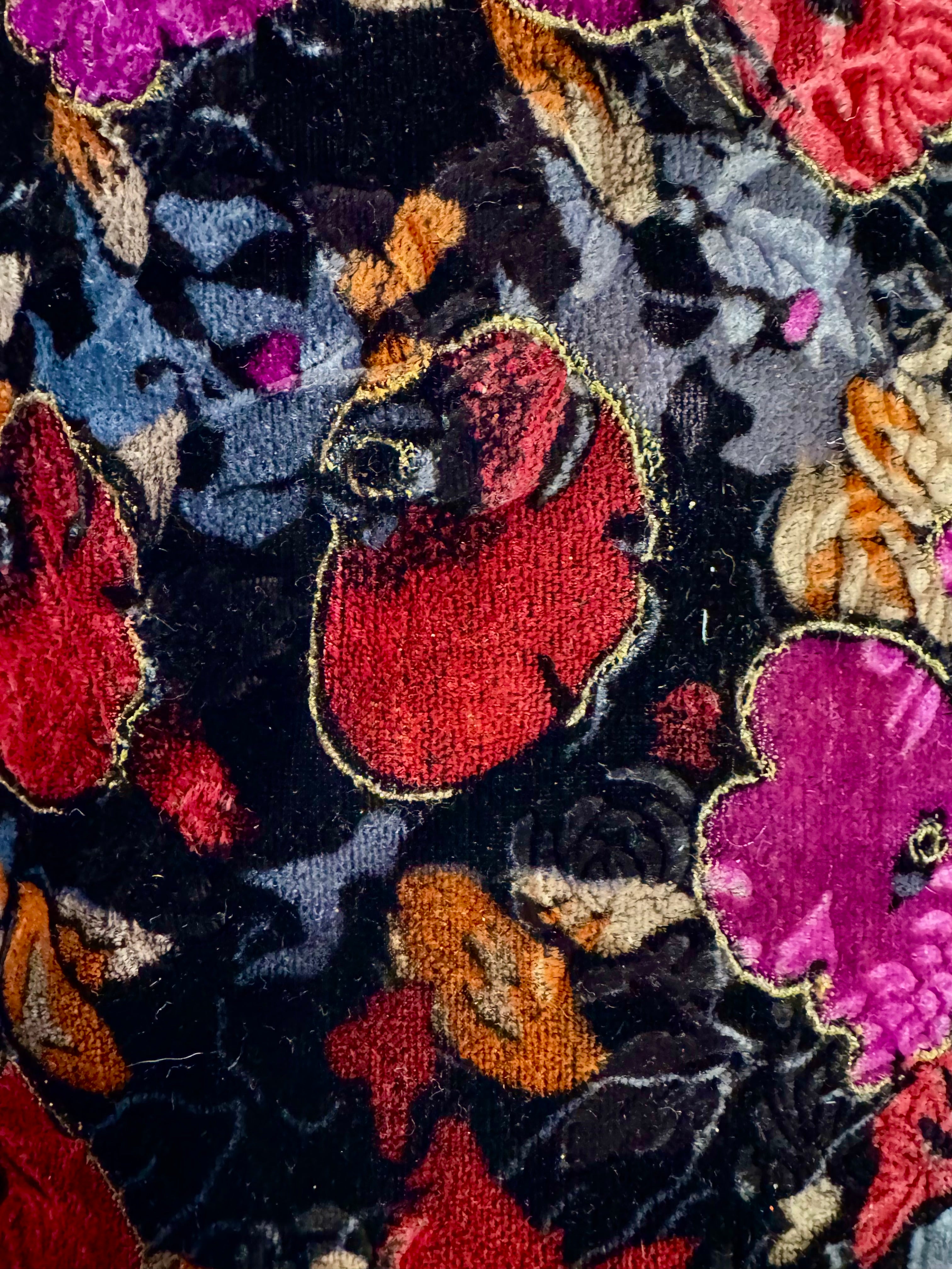 Priced per yard. Beautiful black velvet, embossed with a flower design in vibrant colors, outlined with gold metallic. 48-inches wide.