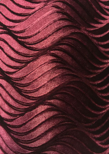 Priced per yard. Burgundy Wavy Stretch Velvet. 60-inch. Perfect for leotards, stretch tutus, and many other costumes. 90% polyester, 10% Elastano. Weight = 35 grams per yard.