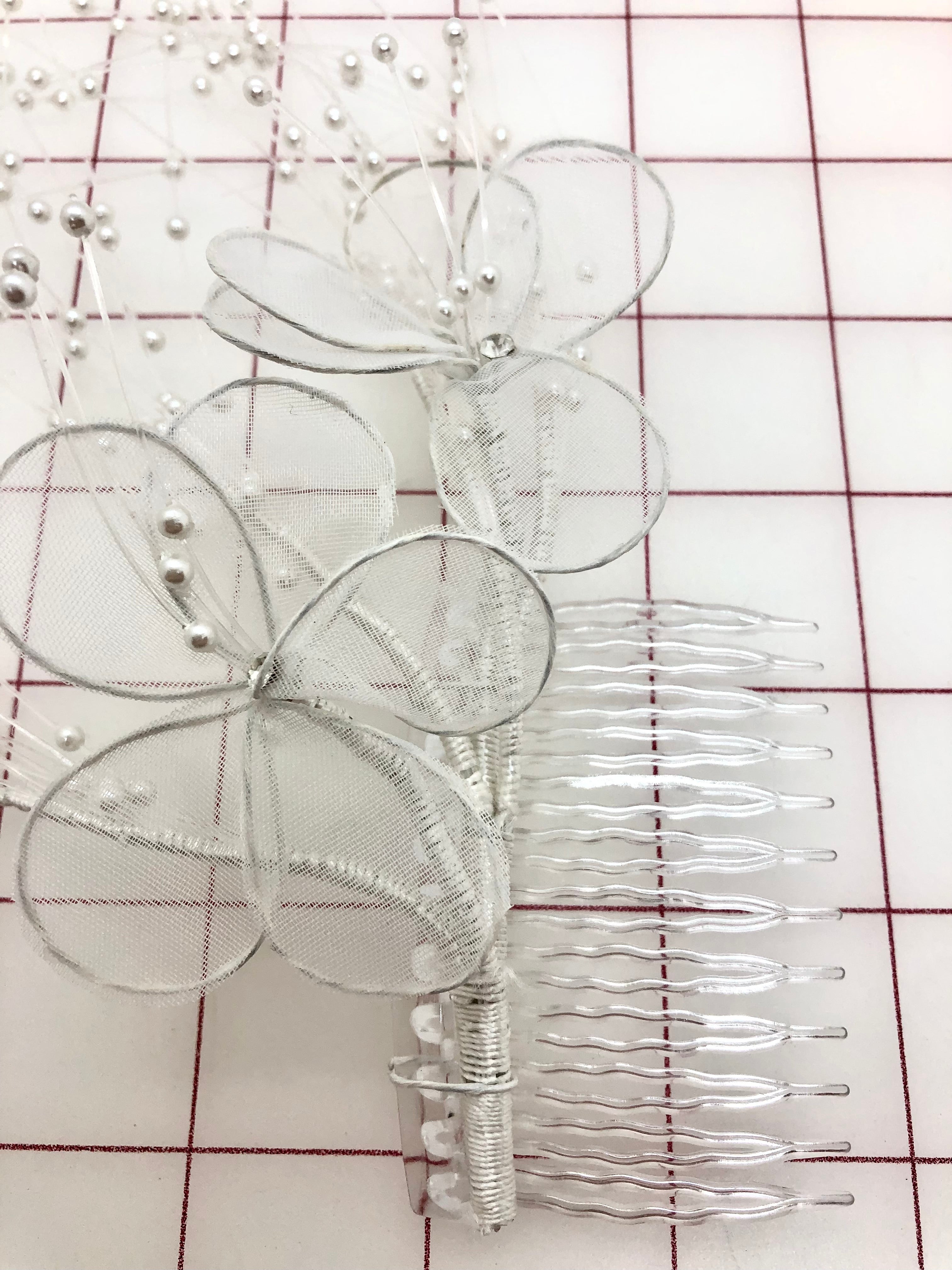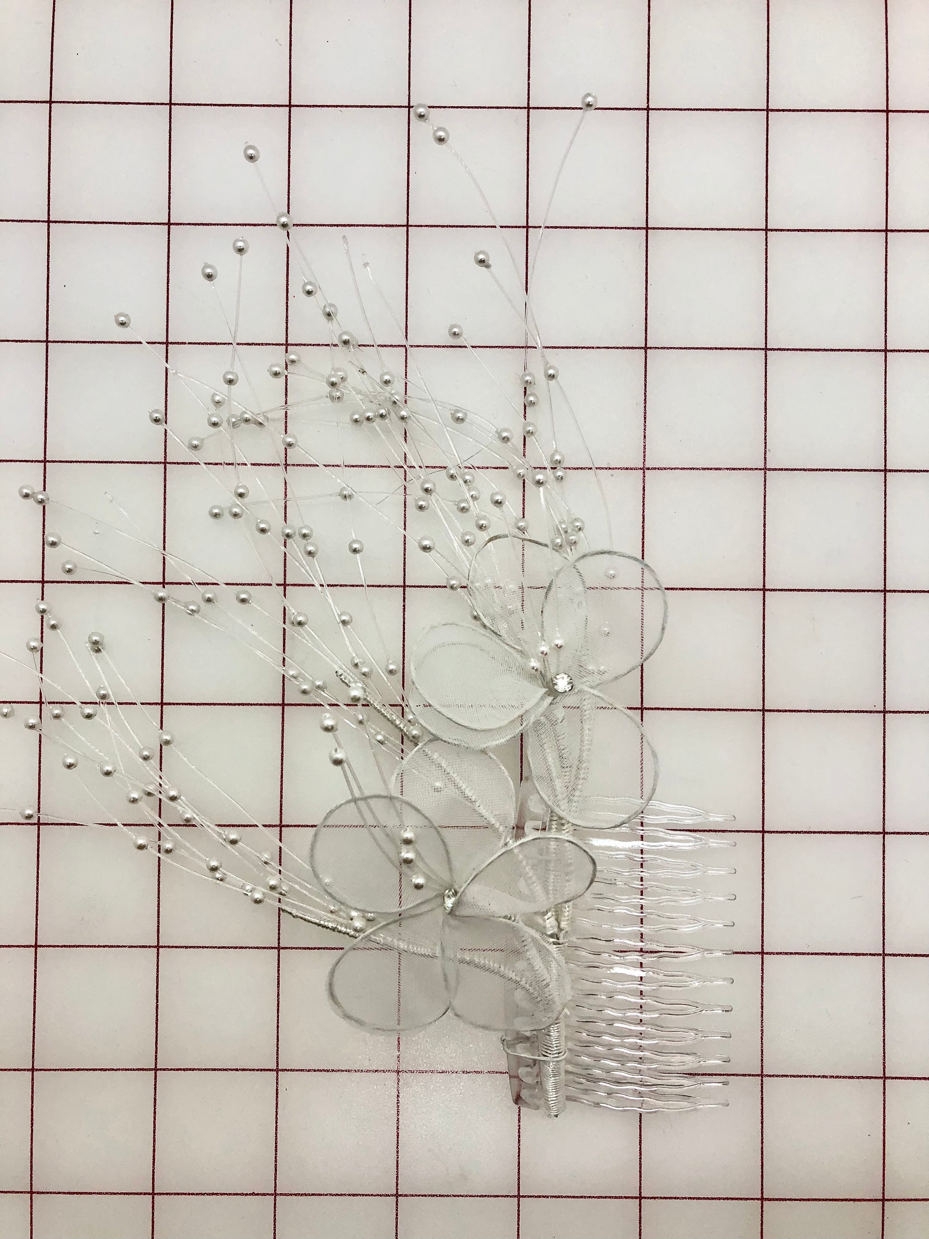 Priced per piece. White wired flowers on a comb. Beautiful side-of-the-bun headpiece!