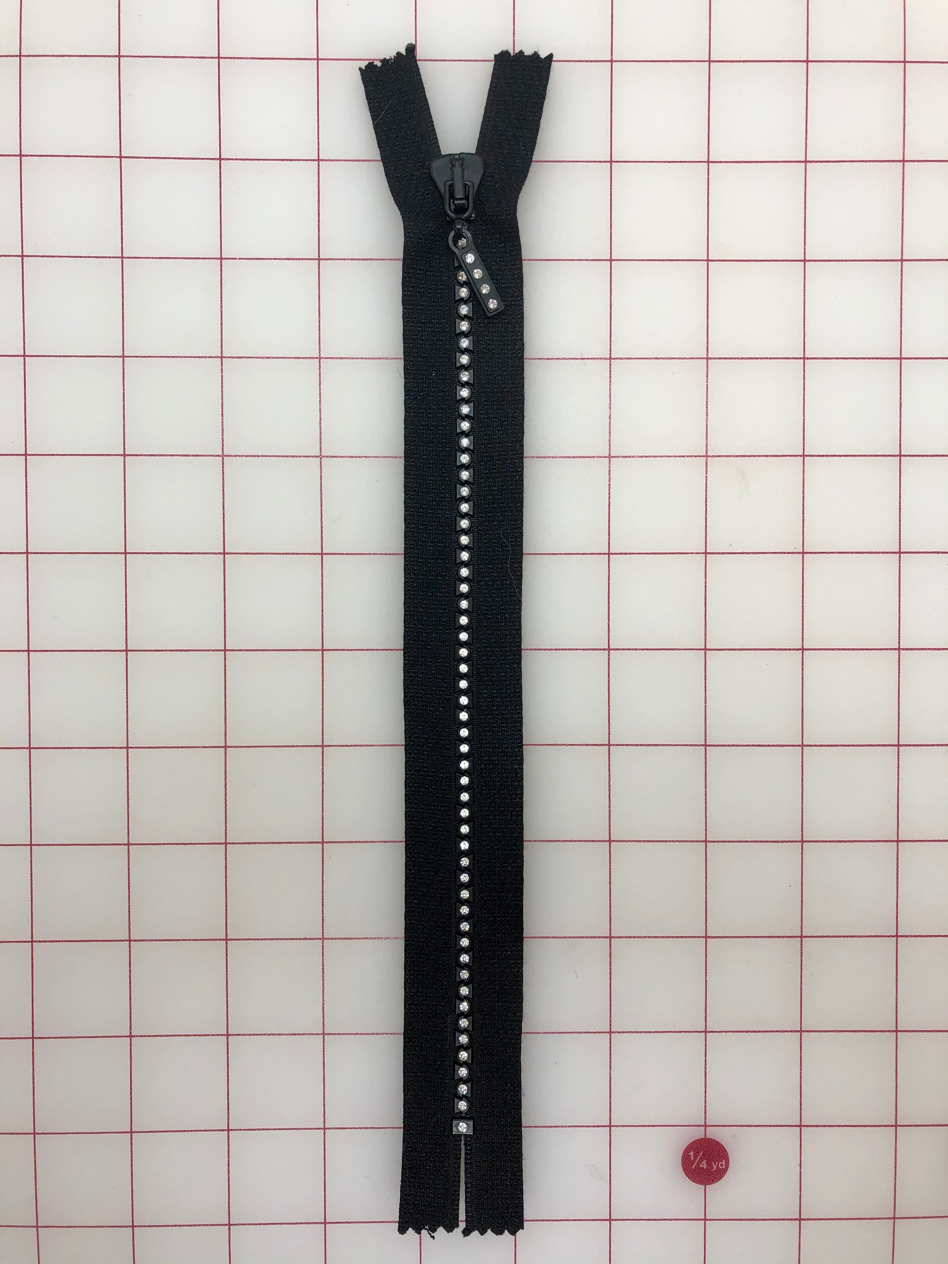 Priced per zipper. 10-inch black zipper, with Swarovski crystal rhinestones.